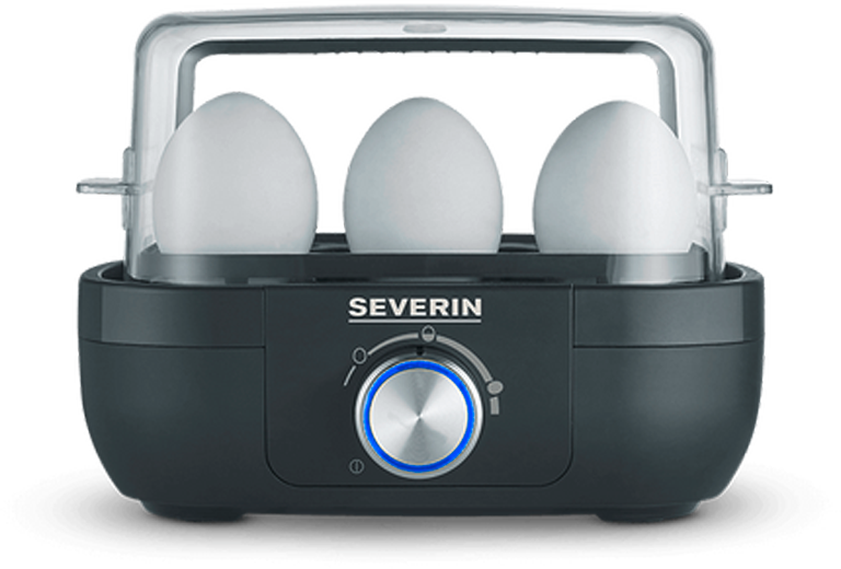 Eierkocher – Einfach, Sicher und Individuell Mit dem Severin Eierkocher bereitest Du schnell und unkompliziert bis zu 6 Frühstückseier in Deinem gewünschten Härtegrad zu – unabhängig von der Ei-Größe. Die elektronische Kochzeitüberwachung sorgt für präzise Ergebnisse und ein akustisches Signal informiert Dich, wenn die Kochzeit beendet ist. Dank klappbarer Haube und seitlicher Griffe außerhalb der Dampfzone bleibt die Bedienung sicher und komfortabel. Der Eierkocher ist aus 100 % Bisphenol A (BPA)-freiem Kunststof fgefertigt und besonders leicht zu reinigen. Details * Für bis zu 6 Eier gleichzeitig geeignet * Einstellbarer Härtegrad durch elektronische Kochzeitüberwachung * Signalton nach abgeschlossener Kochzeit * Klappbare Haube für einfache Bedienung und Reinigung * Seitliche Griffe außerhalb der Dampfzone * 100 % BPA-frei (Kunststoff) * Farbe: Schwarz, Silber * Verpackung und Anleitung überwiegend recyclebar Technische Daten * Leistung: 420 W * Maße Gerät (H × B × T): 13,6 × 19 × 16 cm * Kabellänge: 700 mm * Gewicht: 707 g * Schuko-Stecker Typ E + F (CEE 7/7) Lieferumfang * 1x Eierkocher * 1x Transparenter, klappbarer Deckel * 1x Bedienungsanleitung * 1x Datenblatt Farbe: Schwarz