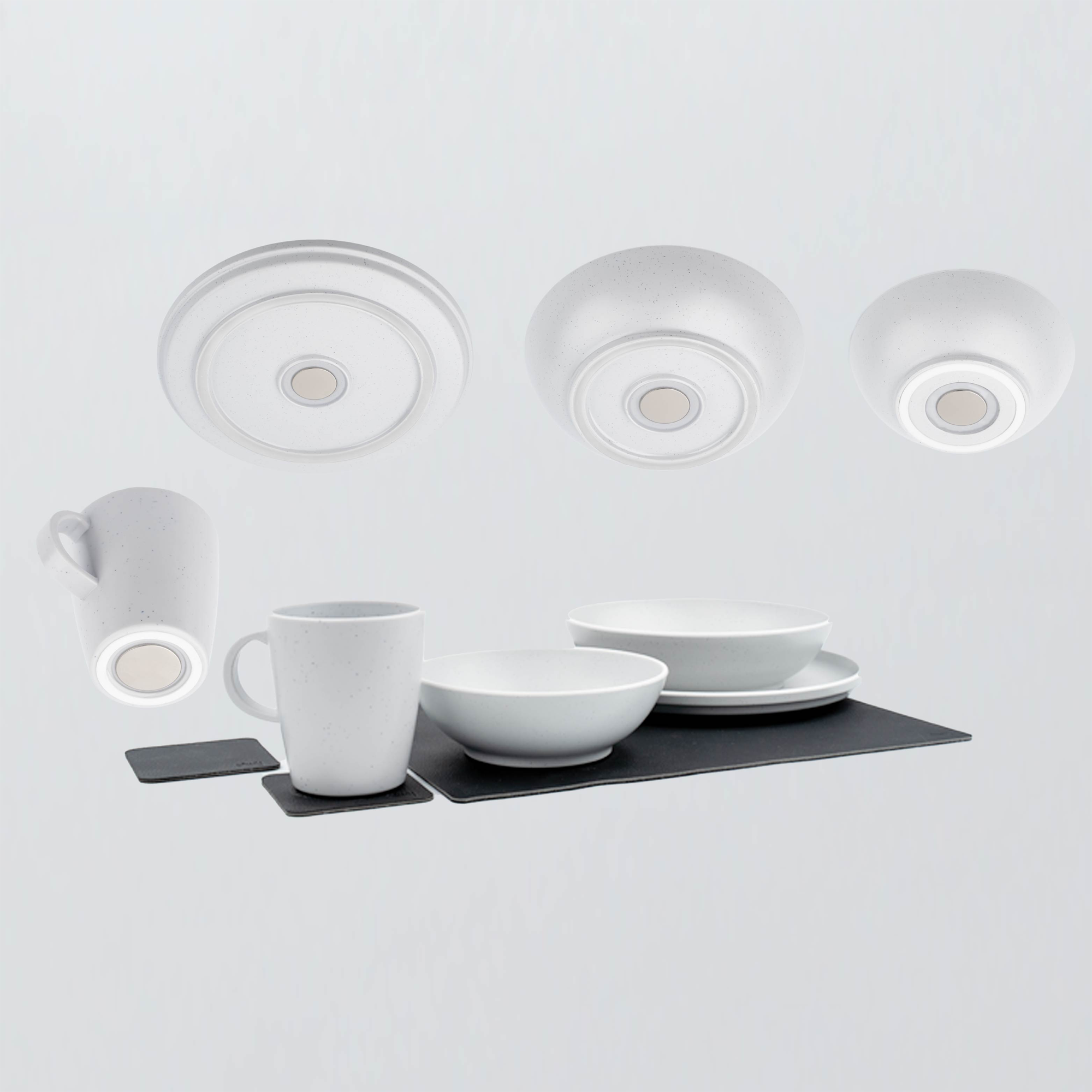 Silwy Magnet-Kunststoff-Geschirrset – sicher, leicht und klapperfrei unterwegs Die hochwertigen Teller sind mit einem handgegossenen Magnet im Boden ausgestattet – für sicheren Halt während der Fahrt. In Kombination mit unserer Metall-Nano-Gel-Matte oder dem passenden Platzset bleiben die Teller zuverlässig an Ort und Stelle. Dank smarter Nano-Gel-Technologie sind beide Unterlagen rückstandslos entfernbar, leicht zu reinigen und wiederverwendbar. Zusätzlich fixieren sich die Teller durch die Magnetkraft auch beim Stapeln – für klapperfreies Verstauen im Schrank. Made in Germany – mit höchstem Qualitätsanspruch. Details: * Sicherer Halt durch integrierten Magnet im Tellerboden – ideal für unterwegs * Kombinierbar mit Nano-Gel-Matte oder Platzset für zuverlässige Fixierung * Rückstandslos entfernbar & wiederverwendbar dank innovativer Nano-Gel-Technologie * Stapelbar & klapperfrei – durch magnetische Verbindung auch im Schrank perfekt verstaut * Hinweis: Nicht Ofen- oder Mikrowellentauglich / es wird Handwäsche empfolen Technische Daten: * Material: Kunststoff * Abmessungen Teller: 2,3 x 25,0 x 25,0 cm * Abmessungen Food-Bowl: 5,2 x 20,0 x 20,0 cm * Abmessungen Bowl: 5,2 x 16,0 x 16,0 cm * Abmessungen Tasse: 10,0 x 9,0 x 9,0 cm * Abmessungen Pad: 0,2 x 8,3 x 8,3 cm * Abmessungen Matte: 0,2 x 27,0 x 36,0 cm * Gewicht pro Set: 2,9 kg Lieferumfang: * 2x Teller * 2x Food-Bowl * 2x Bowl * 2x Tasse * 2x Nano-Gel-Pads * 1x Nano-Gel-Matte Material: Kunststoff, Farbe: Weiß
