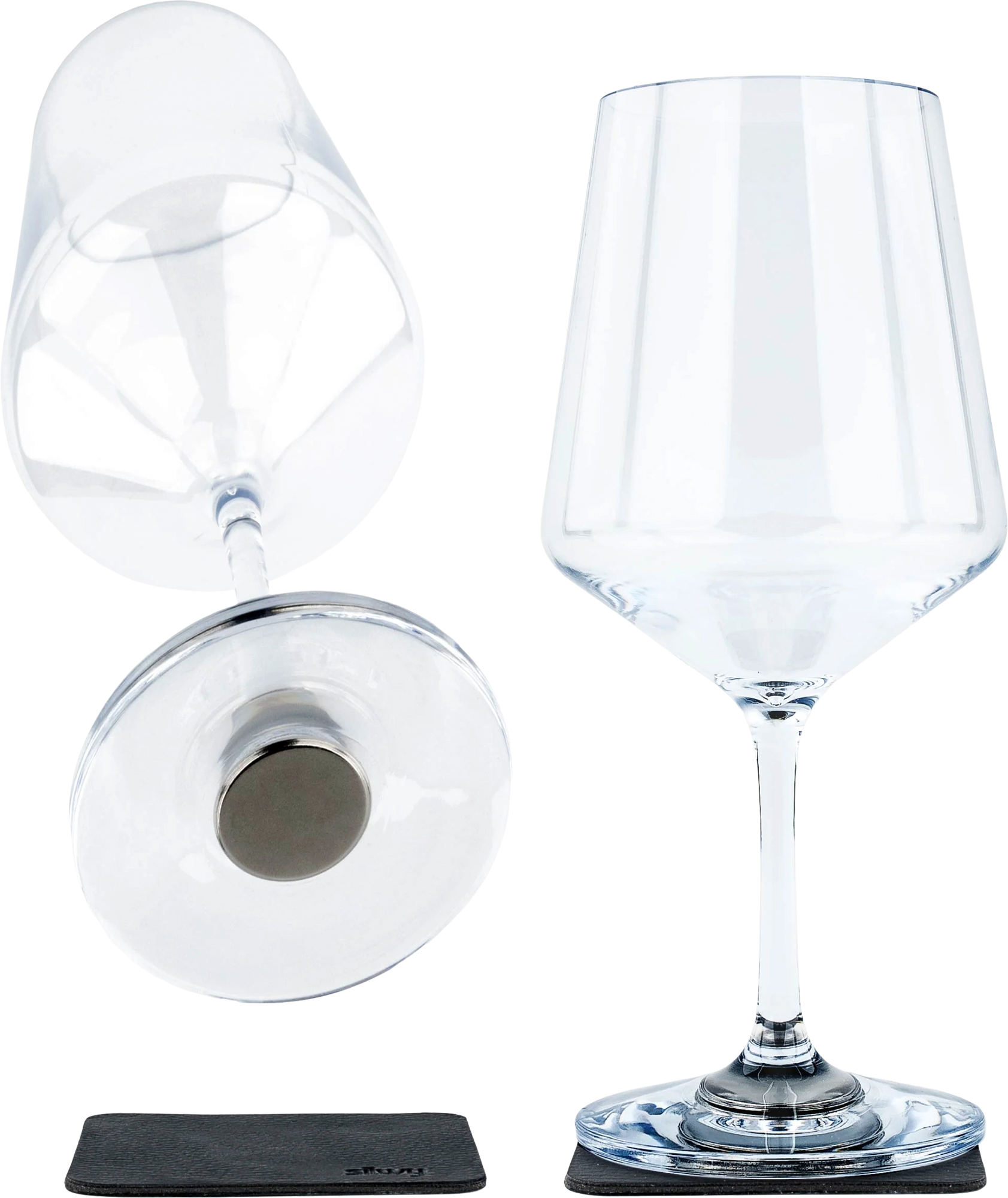 Magnet-Weingläser aus Kunststoff WEIN classic (2er-Set) von silwy Die silwy Magnet-Weingläser WEIN classic verbinden stilvollen Weingenuss mit cleverer Funktion. Im Boden jedes Glases ist ein formschön von Hand vergossener Magnet integriert, der zusammen mit den beiliegenden Metall-Nano-Gel-Pads für sicheren Halt sorgt – ganz ohne Klappern oder Verrutschen. Die Pads haften rutschfest auf fast allen Oberflächen, sind rückstandslos entfernbar, mit Wasser abwaschbar und beliebig oft wiederverwendbar. Damit sie optimal haften, empfiehlt sich die Anwendung auf versiegelten Flächen. Das Magnetverhältnis ist perfekt abgestimmt: Die Gläser stehen stabil und lassen sich dennoch leicht zum Trinken abnehmen. In Kombination mit der separat erhältlichen silwy Magnetleiste kannst du die Gläser sogar schräg, vertikal oder kopfüber lagern – z. B. an der Wand oder unter der Decke. Der BPA-freie Kunststoff ist leicht, bruchfest, geschmacksneutral, langlebig und sieht echtem Glas täuschend ähnlich. Die Reinigung per Hand wird empfohlen. Details: * Integrierter Magnet im Glasboden * Rutschfeste Nano-Gel-Pads haften auf fast allen Oberflächen * Anwendung auf versiegelten Flächen empfohlen * Sicherer Stand und leicht abnehmbar durch optimale Magnetkraft * Kombinierbar mit der silwy Magnetleiste für Wand-/Deckenmontage * Klapperfrei und standsicher beim Transport oder im Schrank * Hochwertige Glasoptik bei bruchsicherem Kunststoff * Hergestellt in Deutschland * Reinigung per Hand empfohlen Technische Daten: * Material: Kunststoff (Polycarbonat) * Frei von BPA * Geschmacksneutral und temperaturbeständig * Kratzunempfindlich, bruchfest und leicht * Füllmenge je Glas: ca. 500 ml * Gewicht je Glas: ca. 110 g * Höhe je Glas: ca. 210 mm * Breite je Glas: ca. 100 mm * Gesamtgewicht Set: ca. 600 g Lieferumfang: * 2 Magnet-Weingläser WEIN classic aus Kunststoff * 2 Metall-Nano-Gel-Pads Pflegehinweis: es wird Handwäsche empfohlen Art Trinkgläser: Weingläser, Material: Polycarbonat, Anzahl: 2: 2 tlg