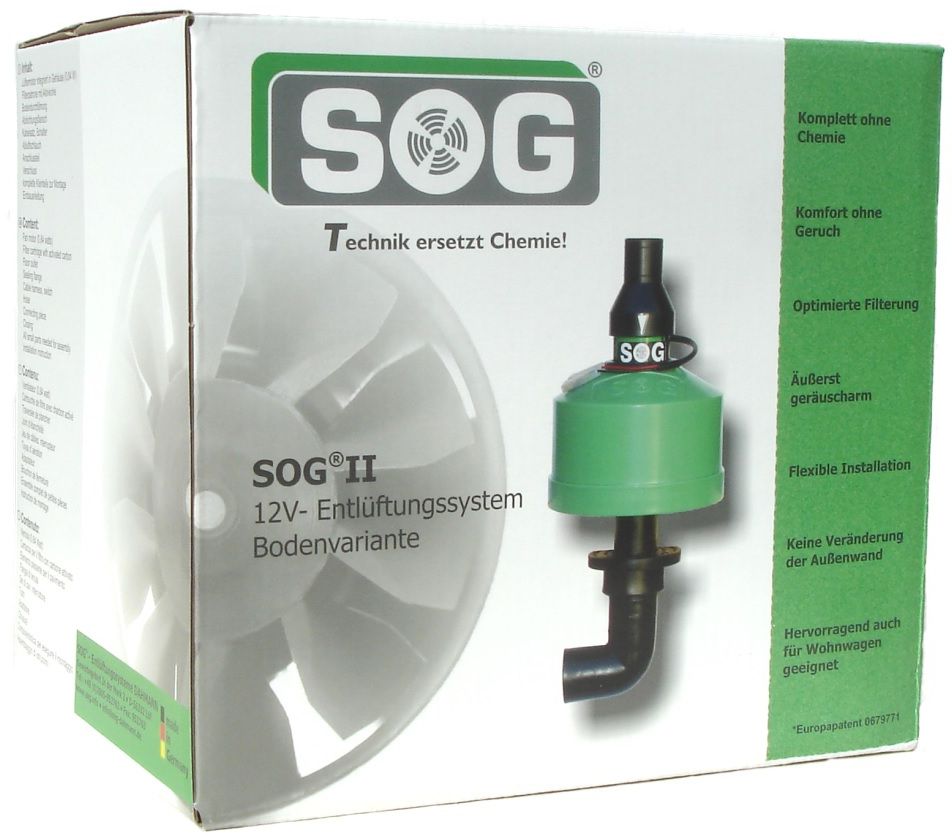 Schluss mit Geruch Durch einen speziell für und mit SOG entwickelten kleinen Hochleistungslüfter (resistent gegen die aggressiven Bestandteile in der Ansaugluft aus dem Fäkaltank | wasserdicht) wird folgender Effekt erzielt * schaltet automatisch beim Öffnen des Toilettenschiebers ein und erzeugt einen Unterdruck im Fäka…tank * dadurch entsteht ein „SOG“ an der Schieberöffnung, der Frischluft und auch die während der Benutzung entstehenden Gerüche ansaugt und nach draußen leitet * das Einziehen der Luft wirkt wie ein Verschluss und verhindert zu 100% das Aufsteigen aller unangenehmen Faulgase aus dem Tank (Komfort ohne Geruch) * Nach automatischem Ausschalten besteht jedoch nach außen weiterhin eine Belüftung und nach innen ein geschlossenes System Umweltschutz Neben dem Ende der Geruchsbelästigung hat die aktive Toilettenentlüftung den großen Vorteil, dass diese ganz ohne den Einsatz von Chemikalien auskommt. Bei geschlossenem Schieber sorgt die Schlauchverbindung des SOG Systems nach draußen dafür, dass der Zersetzungsprozess durch die absichtliche Zufuhr von Sauerstoff in den Fäkaltank, beschleunigt wird. Selbst handelsübliches Toilettenpapier wird in kürzester Zeit zersetzt und der Einsatz von Spezialpapier erübrigt sich. Aktivkohle Ein wichtiger Bestandteil der SOG und SOG II ist Aktivkohle. Hergestellt wird diese, sehr umweltfreundlich, aus organischen Stoffen wie Torf, Nussschalen und Zucker. Diese besteht überwiegend aus Kohlenstoff (meist >90%) mit hochporöser Struktur. Die Poren sind wie bei einem Schwamm untereinander verbunden (offenporig). Aktivkohle wird als Adsorptionsmittel unter anderem in Chemie, Medizin, Wasser- und Abwasserbehandlung, sowie Lüftungs- und Klimatechnik eingesetzt. SOG und SOG Filter bieten überzeugende Vorteile * lange Lebensdauer (1 Jahr) * vollständige Neutralisierung der Gerüche durch lückenlose Verarbeitung * keine Kohlestaubentwicklung * niedriges Gewicht * kompakte Abmessung * Auf regelmäßigen Filterwechsel, nach einem Jahr ist zu achten, um auch vor dem Fahrzeug für gute Luft zu sorgen. Bodenvariante Die SOG II- Kompaktanlage bietet eine Vielzahl von Möglichkeiten, die Toilette zu entlüften. Die Einheit besteht aus einer wechselbaren Filterpatrone in die der Ventilator eingesteckt wird. Diese kann variabel – bis zu drei Meter von der Toilette – platziert werden und an einer beliebigen Stelle über den Boden entlüftet werden (z.B. in der Garage, unter der Sitzbank, im doppelten Boden oder Staufach). Zur weiteren Verlegung hat sich der im Reisemobilzubehör erhältliche gasdichte Sanitärschlauch bewährt, der sich am leichtesten verlegen lässt. Die gelieferten Teile sind auf ein Abwasserrohrsystem abgestimmt, das im Campingfachhandel erhältlich ist (ebenfalls im Onlineshop erhältlich). Bei Caravans deren Serviceklappe der Toilette direkt ins Vorzelt mündet, empfiehlt sich die SOG II Bodenvariante zu verbauen. Die speziell entwickelte Filtereinheit wirkt dabei so effizient, dass die abgesaugte geruchsbelastete Luft komplett neutralisiert wird. SOG II bietet somit eine Entlüftungsvariante, die neben der einfachen Nachrüstung auch eine Vielfalt an Montageorten zulässt. (Filter: 90 mm H, 110 mm Ø | Filtereinheit mit Lüfter: 160 mm H) Maße * Filter: 90 mm H, 110 mm Ø * Filtereinheit mit Lüfter: 160 mm H Inhalt des Komplettbausatzes * Lüftermotor integriert in Gehäuse * Abluftschlauch mit Anschlussstück * Der mitgelieferte Schlauch hat eine Länge von 65 cm. Sollten Sie die Filterpatrone weiter weg von der Toilette installieren (bis zu drei Meter möglich), benötigen Sie einen gasdichten Schlauch (auch im Onlineshop erhältlich) * Adapterteile zum Anschluss an die Cassette * Verschlussstopfen (zur Verwendung bei der Entleerung der Cassette) * Kabelsatz mit Schalter zur Stromversorgung des Lüfters (während der Benutzung) * komplette Kleinteile zur Montage * Montageanleitung (sehr differenziert) *…