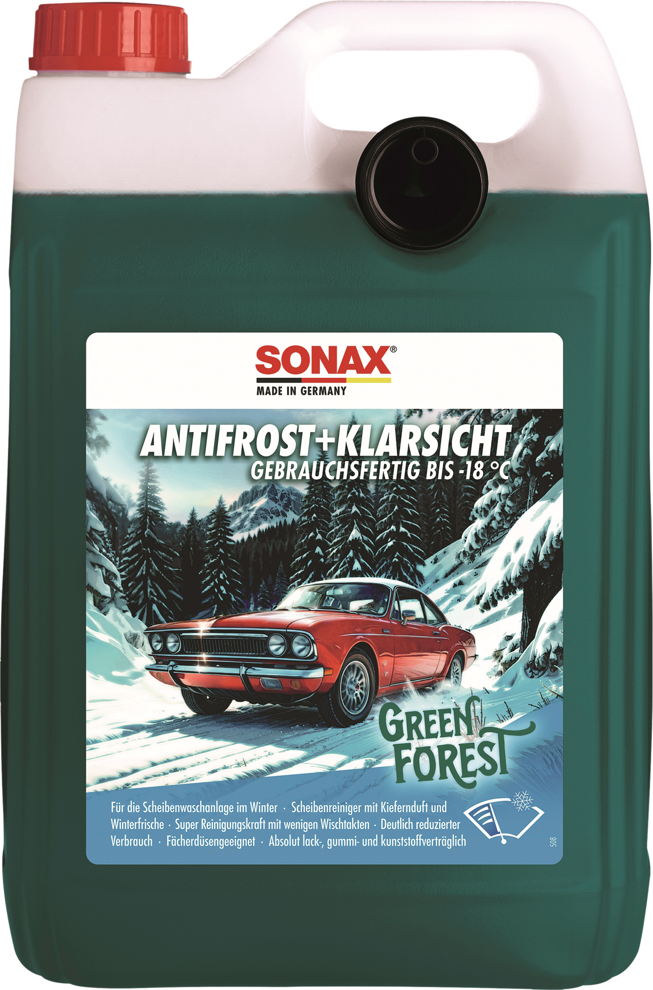 Scheibenreiniger mit Kiefernduft für den Winter Dieser Scheibenreiniger mit Kiefernduft sorgt im Winter für klare Sicht und schützt deine Scheibenwaschanlage. Er entfernt Öl, Ruß, Salz und andere typische Winterverschmutzungen schnell und sparsam. Gleichzeitig verhindert er Düsenvereisung sowie das Einfrieren der Anlage. Der Reiniger ist absolut verträglich für Lack, Gummi und Kunststoff und verursacht keine Spannungsrisse oder Blindstellen an Scheinwerfern. Auch für moderne Laser-, Matrix-LED- und Xenon-Scheinwerfer sowie empfindliche Matt- oder Reparaturlacke geeignet. Mit Glycerin hält er Gummi geschmeidig, verhindert Rubbeln der Wischerblätter und ist für Fächerdüsen und neue Wischertechnologien optimal geeignet. Details: * Entfernt Öl, Ruß, Salz und Winterverschmutzungen * Verhindert Düsenvereisung und Einfrieren der Anlage * Lack-, gummi- und kunststoffverträglich * Geeignet für Laser-, Matrix-LED- und Xenon-Scheinwerfer * Getestet auf Mattlacken, Folierungen und Reparaturlacken * Mit Glycerin: hält Gummi geschmeidig * Kein Rubbeln der Wischerblätter * Fächerdüsentauglich, passend für moderne Wischertechnologien * Mit angenehmem Kiefernduft Technische Daten: * Anwendung: Scheibenwaschanlage im Winter * Eigenschaften: reinigend, frostschützend, pflegend Lieferumfang: * Scheibenreiniger mit Kiefernduft für die Scheibenwaschanlage Volumen: 5 l