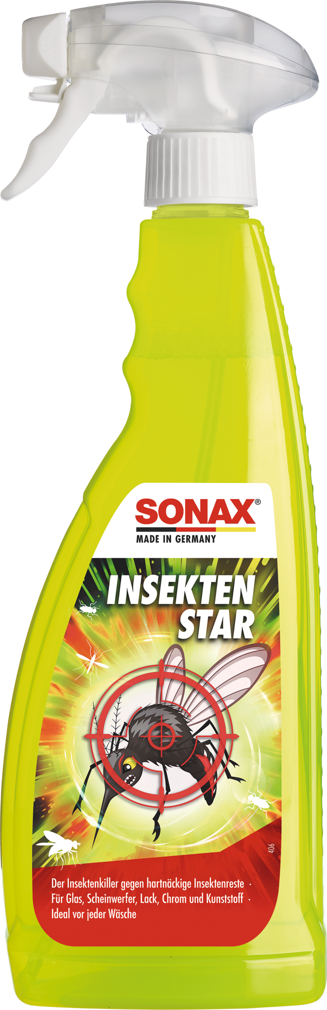 Schnell weg mit den biestern – insektenstar für eine lackschonende reinigung Mit dem InsektenStar entfernst du selbst hartnäckige und angetrocknete Insektenrückstände schnell, gründlich und schonend von Glas, Lack, Chrom und Kunststoff. Die Oberflächen werden dabei nicht angegriffen. Ideal zur Vorbereitung vor jeder Wagenwäsche – für ein rundum sauberes Ergebnis ohne Rückstände. Details: * Löst frische und angetrocknete Insektenverschmutzungen * Für Glas, Lack, Chrom und Kunststoff geeignet * Greift die behandelten Oberflächen nicht an * Ideal zur Vorreinigung vor der Wagenwäsche * Nicht auf heißen Flächen anwenden und nicht antrocknen lassen * Nicht für Motorräder geeignet * Vor Frost schützen Technische Daten: * Inhalt: 750 ml * Einwirkzeit: 3–5 Minuten * Anwendung: aufsprühen, einwirken lassen, mit Wasser gründlich abspülen Lieferumfang: * 1 × InsektenStar (750 ml) Art Pflege/Reinigung: Reinigung, Füllmenge: 750 ml