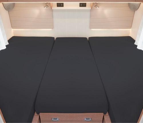 3-teiliges Spannbetttuch-Set für Heckbetten in Wohnmobilen und Wohnwägen Dieses hochwertige Spannbetttuch-Set ist speziell für typische Heckbetten in Wohnmobilen und Wohnwägen konzipiert. Es besteht aus 2 Längsmatratzenüberzügen und einem kleinen Überzug für die Zwischenmatratze. Das elastische Jersey-Material aus 97 % Baumwolle und 3 % Elasthan sorgt für eine perfekte Passform und ist sehr pflegeleicht. Details * 2 Überzüge für Längsmatratzen (70 x 190 cm bis 85 x 210 cm) * 1 Überzug für die Zwischenmatratze (35 x 130 cm bis 50 x 145 cm) * Sehr elastisch für eine optimale Passform * Mit Rundumgummi für sicheren Halt * Waschen bis 60 °C, trocknergeeignet Technische Daten * Material: 97 % Baumwolle, 3 % Elasthan * Gewicht: ca. 180 g/qm * Eigenschaften: Pilling- und bügelfrei, elastisch, bügelleicht * Passend für Matratzengrößen bis ca. 18 cm Matratzenhöhe Lieferumfang * 2 Einzelspannbettlaken für Längsmatratzen * 1 Bettlaken für die Zwischenmatratze Art Lattenroste und Matratze: Zubehör, Farbe: anthrazit