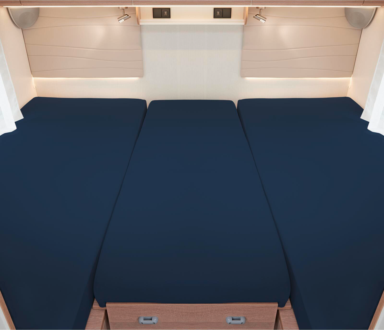 3-teiliges Spannbetttuch-Set für Heckbetten in Wohnmobilen und Wohnwägen Dieses hochwertige Spannbetttuch-Set ist speziell für typische Heckbetten in Wohnmobilen und Wohnwägen konzipiert. Es besteht aus 2 Längsmatratzenüberzügen und einem kleinen Überzug für die Zwischenmatratze. Das elastische Jersey-Material aus 97 % Baumwolle und 3 % Elasthan sorgt für eine perfekte Passform und ist sehr pflegeleicht. Details * 2 Überzüge für Längsmatratzen (70 x 190 cm bis 85 x 210 cm) * 1 Überzug für die Zwischenmatratze (35 x 130 cm bis 50 x 145 cm) * Sehr elastisch für eine optimale Passform * Mit Rundumgummi für sicheren Halt * Waschen bis 60 °C, trocknergeeignet Technische Daten * Material: 97 % Baumwolle, 3 % Elasthan * Gewicht: ca. 180 g/qm * Eigenschaften: Pilling- und bügelfrei, elastisch, bügelleicht * Passend für Matratzengrößen bis ca. 18 cm Matratzenhöhe Lieferumfang * 2 Einzelspannbettlaken für Längsmatratzen * 1 Bettlaken für die Zwischenmatratze Art Lattenroste und Matratze: Zubehör, Farbe: dunkelblau