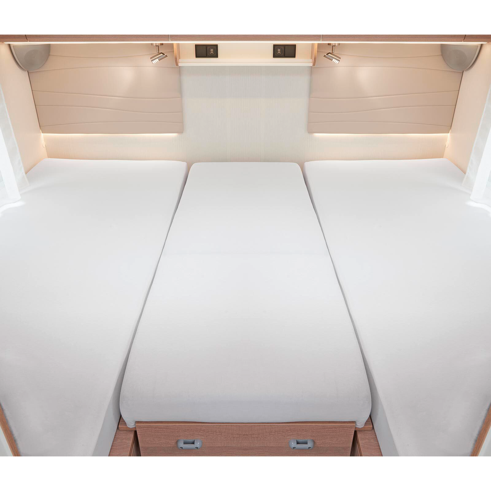 3-teiliges Spannbetttuch-Set für Heckbetten in Wohnmobilen und Wohnwägen Dieses hochwertige Spannbetttuch-Set ist speziell für typische Heckbetten in Wohnmobilen und Wohnwägen konzipiert. Es besteht aus 2 Längsmatratzenüberzügen und einem kleinen Überzug für die Zwischenmatratze. Das elastische Jersey-Material aus 97 % Baumwolle und 3 % Elasthan sorgt für eine perfekte Passform und ist sehr pflegeleicht. Details * 2 Überzüge für Längsmatratzen (70 x 190 cm bis 85 x 210 cm) * 1 Überzug für die Zwischenmatratze (35 x 130 cm bis 50 x 145 cm) * Sehr elastisch für eine optimale Passform * Mit Rundumgummi für sicheren Halt * Waschen bis 60 °C, trocknergeeignet Technische Daten * Material: 97 % Baumwolle, 3 % Elasthan * Gewicht: ca. 180 g/qm * Eigenschaften: Pilling- und bügelfrei, elastisch, bügelleicht * Passend für Matratzengrößen bis ca. 18 cm Matratzenhöhe Lieferumfang * 2 Einzelspannbettlaken für Längsmatratzen * 1 Bettlaken für die Zwischenmatratze Art Lattenroste und Matratze: Zubehör, Farbe: silber