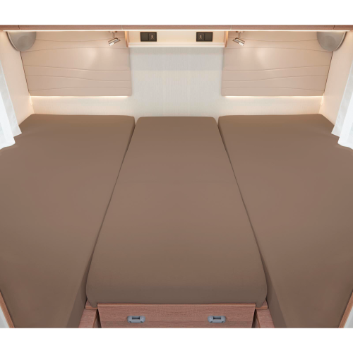 3-teiliges Spannbetttuch-Set für Heckbetten in Wohnmobilen und Wohnwägen Dieses hochwertige Spannbetttuch-Set ist speziell für typische Heckbetten in Wohnmobilen und Wohnwägen konzipiert. Es besteht aus 2 Längsmatratzenüberzügen und einem kleinen Überzug für die Zwischenmatratze. Das elastische Jersey-Material aus 97 % Baumwolle und 3 % Elasthan sorgt für eine perfekte Passform und ist sehr pflegeleicht. Details * 2 Überzüge für Längsmatratzen (70 x 190 cm bis 85 x 210 cm) * 1 Überzug für die Zwischenmatratze (35 x 130 cm bis 50 x 145 cm) * Sehr elastisch für eine optimale Passform * Mit Rundumgummi für sicheren Halt * Waschen bis 60 °C, trocknergeeignet Technische Daten * Material: 97 % Baumwolle, 3 % Elasthan * Gewicht: ca. 180 g/qm * Eigenschaften: Pilling- und bügelfrei, elastisch, bügelleicht * Passend für Matratzengrößen bis ca. 18 cm Matratzenhöhe Lieferumfang * 2 Einzelspannbettlaken für Längsmatratzen * 1 Bettlaken für die Zwischenmatratze Art Lattenroste und Matratze: Zubehör, Farbe: taupe