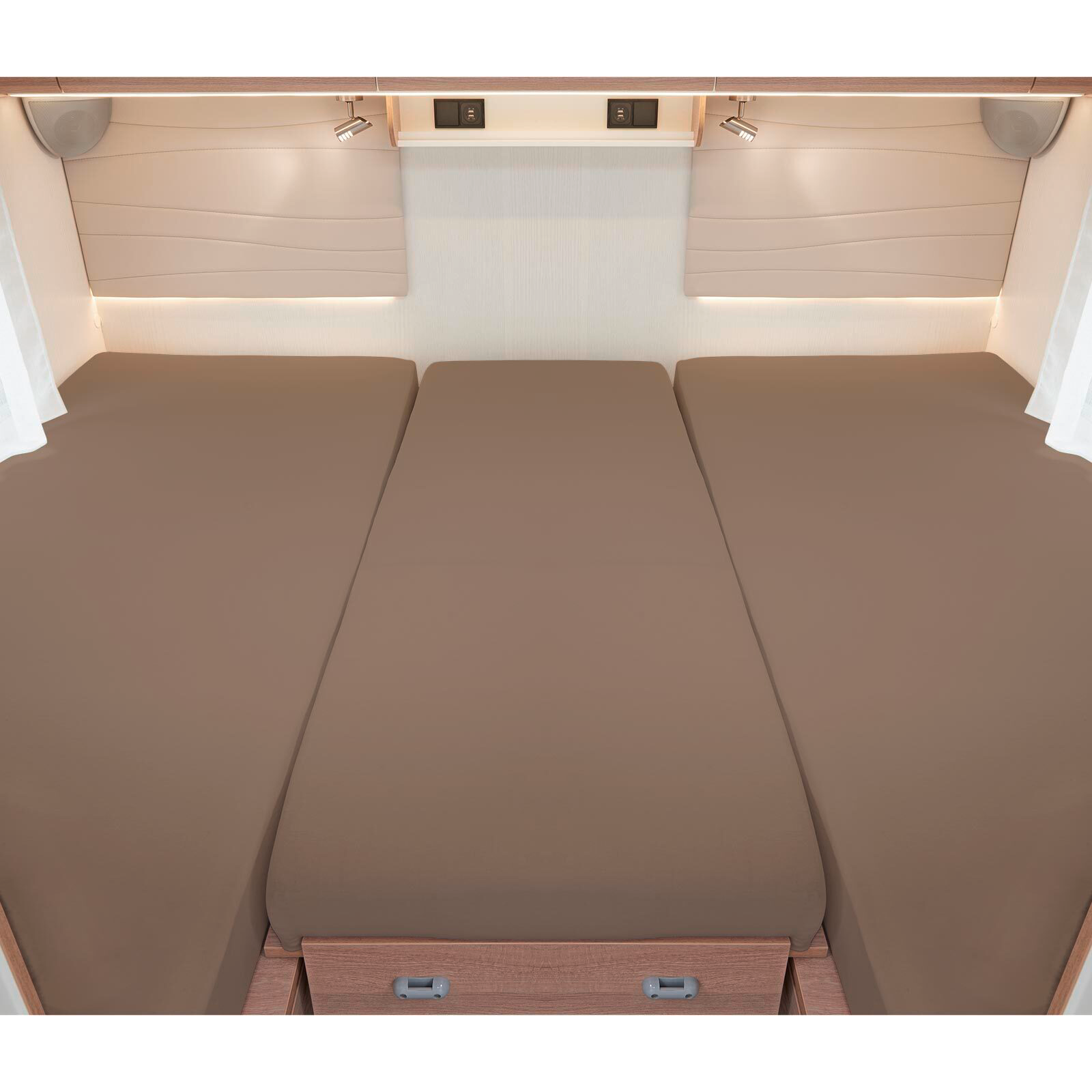 3-teiliges Spannbetttuch-Set für Heckbetten in Wohnmobilen und Wohnwägen Dieses hochwertige Spannbetttuch-Set ist speziell für typische Heckbetten in Wohnmobilen und Wohnwägen konzipiert. Es besteht aus 2 Längsmatratzenüberzügen und einem kleinen Überzug für die Zwischenmatratze. Das elastische Jersey-Material aus 97 % Baumwolle und 3 % Elasthan sorgt für eine perfekte Passform und ist sehr pflegeleicht. Details * 2 Überzüge für Längsmatratzen (70 x 190 cm bis 85 x 210 cm) * 1 Überzug für die Zwischenmatratze (35 x 130 cm bis 50 x 145 cm) * Sehr elastisch für eine optimale Passform * Mit Rundumgummi für sicheren Halt * Waschen bis 60 °C, trocknergeeignet Technische Daten * Material: 97 % Baumwolle, 3 % Elasthan * Gewicht: ca. 180 g/qm * Eigenschaften: Pilling- und bügelfrei, elastisch, bügelleicht * Passend für Matratzengrößen bis ca. 18 cm Matratzenhöhe Lieferumfang * 2 Einzelspannbettlaken für Längsmatratzen * 1 Bettlaken für die Zwischenmatratze Art Lattenroste und Matratze: Zubehör, Farbe: taupe