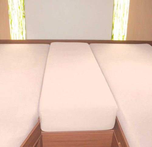 Das Spannbettlaken Set für typische Heckbetten in Wohnmobilen oder Wohnwagen. Das Set besteht aus Laken für zwei Längsmatratzen und der Zwischenmatratze. Aus sehr elastischem Material, sehr gute Passform, glatte und feine Oberfläche. Das 3-teilige Set beinhaltet: * 2 Einzelspannbettlaken, passend für Matratzengröße ca. 70 x 190 cm bis 85 x 210 cm, auch kein Problem bei einer leichten Ecke oder Abrundung der Matratze (siehe Abbildung) * 1 Bettlaken für das Zwischenstück, passend für Größen von ca. 35 x 130 cm bis 50 x 145 cm Qualität: * pilling- und bügelfrei * ca. 160 g/qm Art Lattenroste und Matratze: Zubehör, Pflege: Trockner geeignet, schonende Trocknungwaschbar bis 60 °C, Gewicht: 800 g, Material Bezug: Jersey, Matratzenhöhe: 8-15 cm, Material: 97% Baumwolle, 3% Elasthan, Farbe: leinen