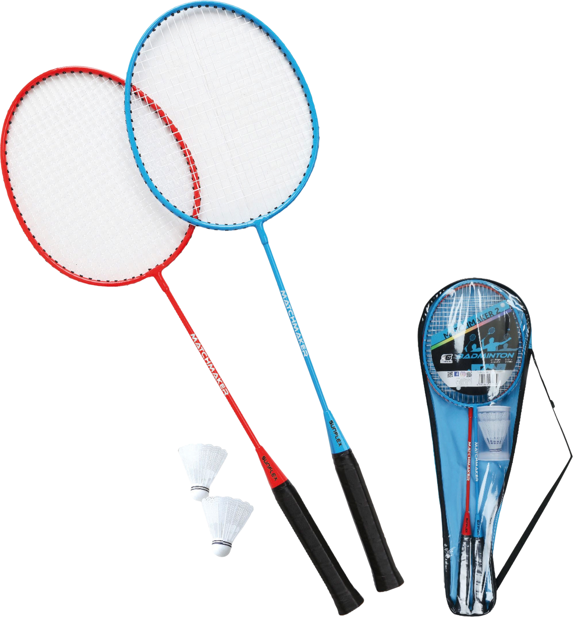 Sunflex MATCHMAKER Badmintonsets – für Spielspaß zu zweit Die sunflex MATCHMAKER Sets bieten für jedes Spielniveau die passende Ausrüstung. Ob für Kinder, Freizeitspieler oder ambitionierte Duelle: Jedes Set enthält zwei Schläger und zwei Federbälle in einer praktischen Nylontragetasche. Die Pro-Variante enthält zusätzlich ein Netz mit Pfosten für das komplette Spielerlebnis. Details: * Drei Varianten: Matchmaker Junior, Matchmaker 2 und Matchmaker 2 Pro * 2 Schläger mit kindgerechtem oder normalem Schaft * Inklusive 2 Federbällen pro Set * Nylontragetasche zur einfachen Mitnahme * Pro-Variante mit Netz und Pfosten Technische Daten: * Schlägeranzahl: 2 * Federbälle: 2 Kunststoffbälle je Set * Tasche: Nylon * Variante Junior: verkürzter Schaft * Variante Pro: inkl. Netz und Pfosten Lieferumfang: * 2 Schläger * 2 Federbälle * 1 Nylontragetasche * (nur Pro-Variante: zusätzlich 1 Netz mit Pfosten) Ausführung: Matchmaker 2, Farbe: rot / blau