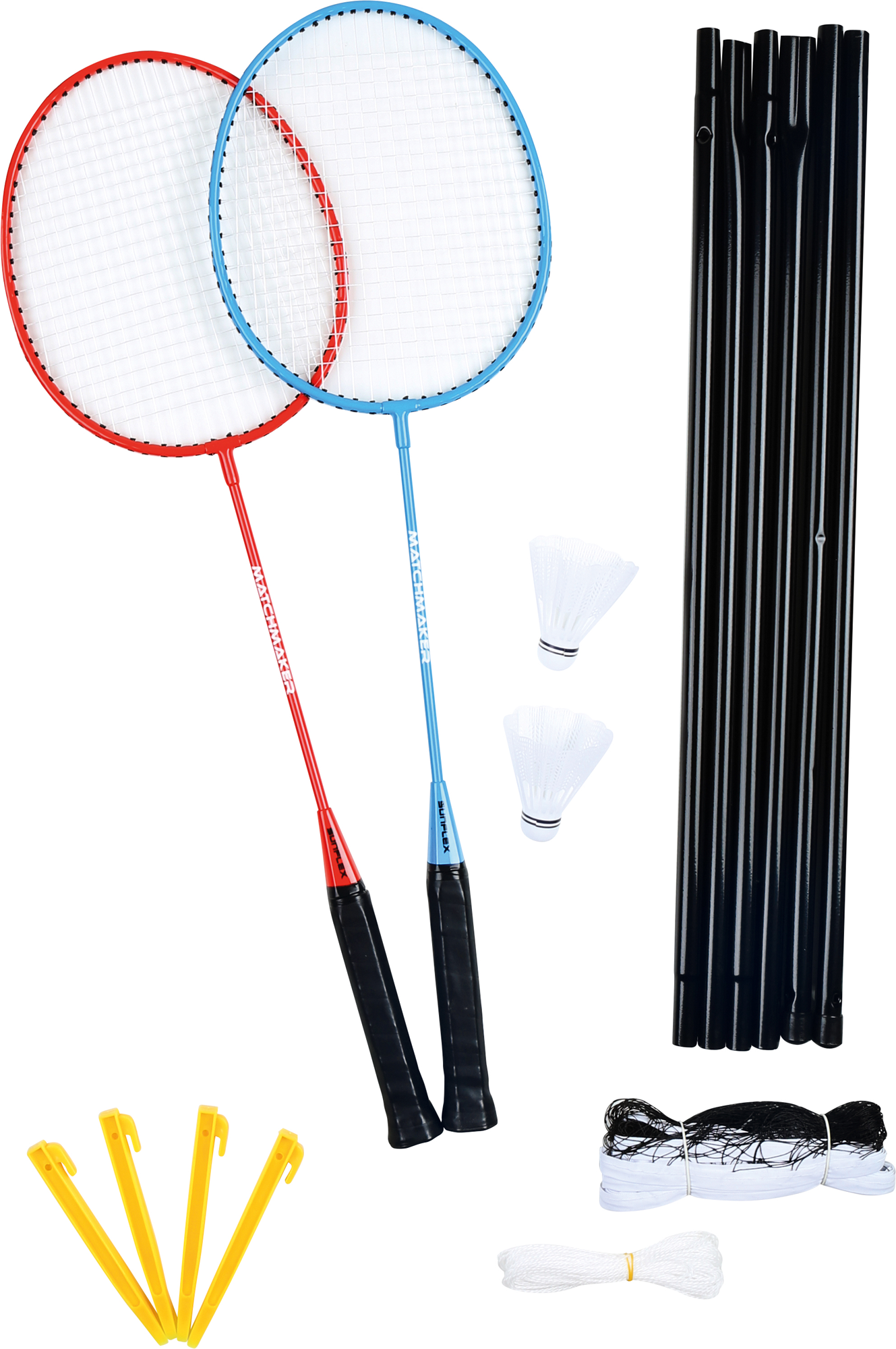 Sunflex MATCHMAKER Badmintonsets – für Spielspaß zu zweit Die sunflex MATCHMAKER Sets bieten für jedes Spielniveau die passende Ausrüstung. Ob für Kinder, Freizeitspieler oder ambitionierte Duelle: Jedes Set enthält zwei Schläger und zwei Federbälle in einer praktischen Nylontragetasche. Die Pro-Variante enthält zusätzlich ein Netz mit Pfosten für das komplette Spielerlebnis. Details: * Drei Varianten: Matchmaker Junior, Matchmaker 2 und Matchmaker 2 Pro * 2 Schläger mit kindgerechtem oder normalem Schaft * Inklusive 2 Federbällen pro Set * Nylontragetasche zur einfachen Mitnahme * Pro-Variante mit Netz und Pfosten Technische Daten: * Schlägeranzahl: 2 * Federbälle: 2 Kunststoffbälle je Set * Tasche: Nylon * Variante Junior: verkürzter Schaft * Variante Pro: inkl. Netz und Pfosten Lieferumfang: * 2 Schläger * 2 Federbälle * 1 Nylontragetasche * (nur Pro-Variante: zusätzlich 1 Netz mit Pfosten) Ausführung: Matchmaker 2 Pro, Farbe: rot / blau