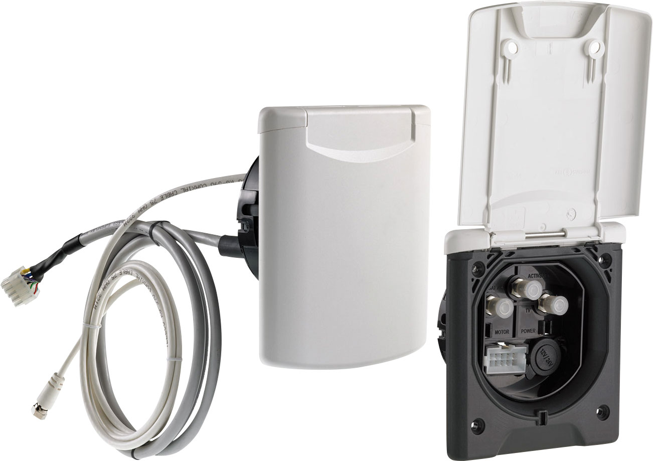 Material: ABS, Farbe: außen weiß, innen schwarz Eingänge: * Steckverbinder für Motorkabel ActivSat 10-polig * F-Steckverbinder für Koaxialkabel ActivSat * F-Steckverbinder für zweites Koaxialkabel (ActivSat Twin) * F-Steckverbinder für Koaxialkabel für externes TV * 12 Vdc Universalsteckdose (max. 10A) mit Gummiabdeckung und Faston für die Versorgung des externen TVs Verfügbare Modelle: * PAS/W – Anschluss ActivSat Westacc * PAS/F – Anschluss ActivSat Fawo Ausführung: Fawo