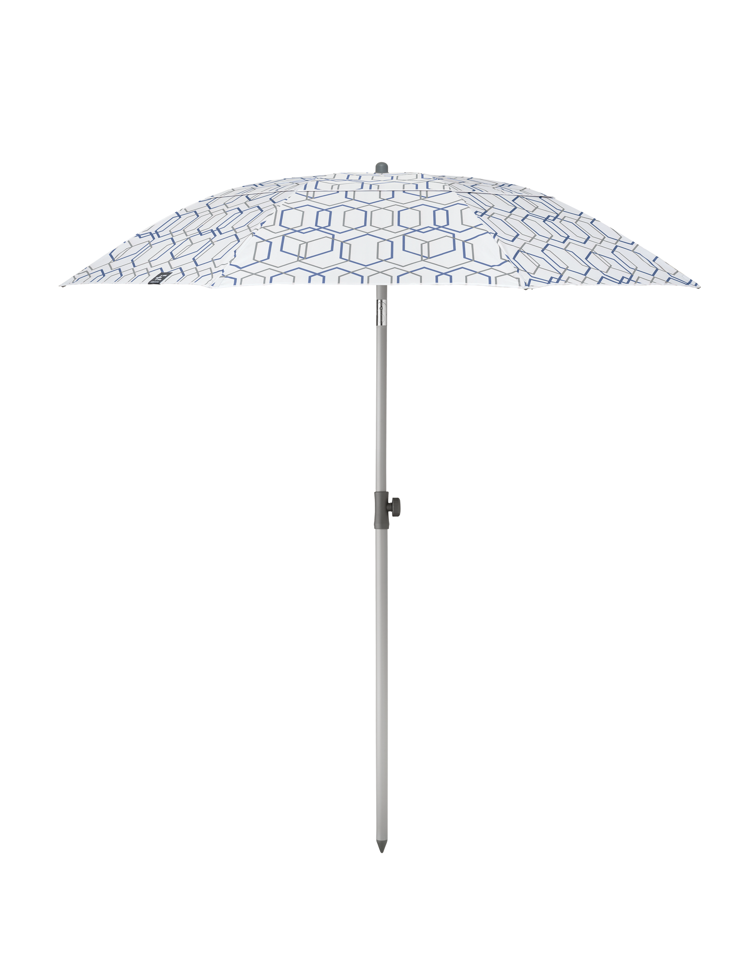 Leichter Strandschirm aus 100% recyceltem Polyester mit einer Spannweite von 180 cm. Die alubeschichtete Innenseite verhindert 98% der schädlichen UV-Strahlen (USF 50+). Der Schirm kann mittels eines Knickmechanismus nach rechts oder links zur Seite geneigt werden. Der Schirm besteht aus 2 Teilen, was den Transport in der mitgelieferten Tragetasche auf dem Weg zum Strand erleichtert. Produkteigenschaften: * Gewebe: 100% recyceltes Polyester mit Sonnenschutz-Silberbeschichtung (USF 50+) * Speichensystem: Fiberglas 6 mm/8 Stück * Schirmstiel: Aluminium D 28/32 mm mit linker und rechter Kippbewegung * Besonderheit: Ablagenetz * Tragetasche: Polyester mit PU-Beschichtung * Schirmdurchmesser: 180 cm * Packmaß: 13 x 120 cm * Gewicht: 1,9 kg Lieferumfang: 1 Schirm 1 Tragetasche Art Wind-/ Sicht- und Sonnenschutz: Sonnenschutz, Farbe: Blue/Grey, Packmaß (LxB): 13 x 120 cm