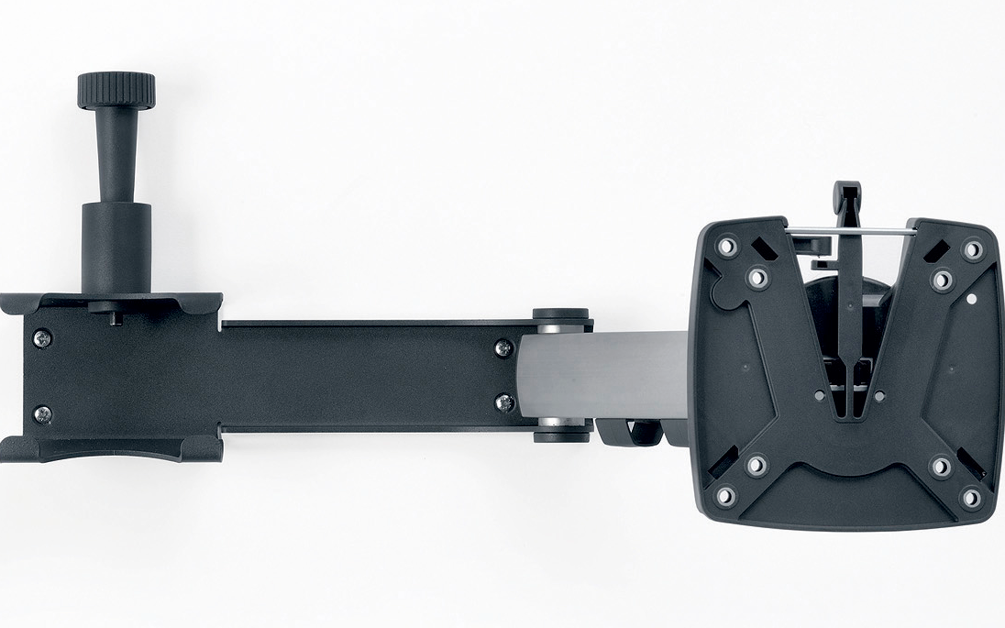 Wandhalterung mit Einfachgelenk (2 Drehpunkte), Arretierung, Quickrelease mit Schnellverschlusstaste und sauberer Kabelführung durch Kabelclips. Drehbar 180°, neigbar 45° Drehbar: Ja, Drehpunkte: 2 Stück, Neigbar: Ja, Armlänge: 20 cm, Max belastbar: 12 kg, Montage TV-Halterung: Wand, Farbe: silber, schwarz, Gewicht: 1,5 kg