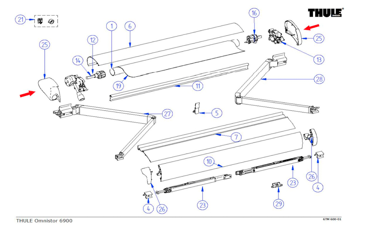 Endkappen für Kurbelantrieb passend zu Thule Omnistor 6502 / 6900 Farbe: Eloxiert Es handelt sich um Pos.25 auf dem Bild