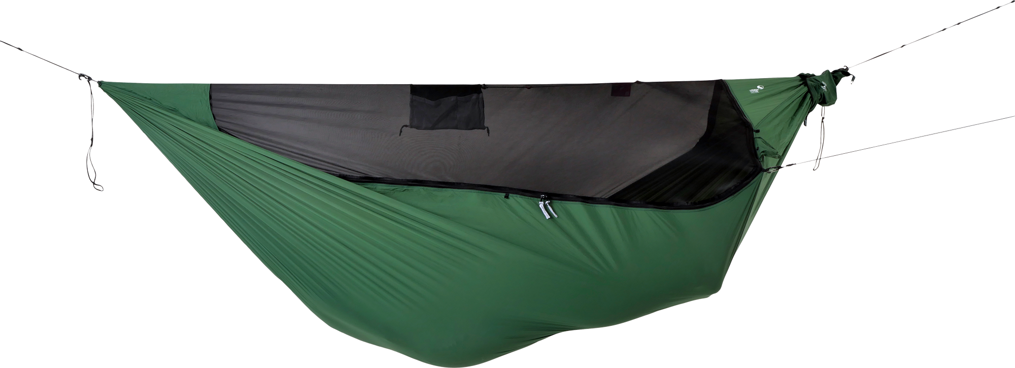 Die Lightest PRO-Hängematte wurde als einfache und immer einsatzbereite Lösung für das Schlafen im Freien mit Insektenschutz konzipiert. Nach viel Getüftel, ist es uns gelungen Komfort und Funktionalität zu optimieren und gleichzeitig das Gewicht zu minimieren. Sie ist ebenfalls in weniger als einer Minute aufgebaut und ihre auf bis zu 3,1 m variierbare Gesamtlänge bieten dir zusätzlichen Platz, um dich auszubreiten und selbst in einer diagonalen Position außergewöhnlichen Komfort zu genießen. Der „No-see-um“ Insektenschutz — das integrierte und verstaubare Insektennetz aus sorgfältig ausgewähltem Premium Mikromaschengewebe bietet verlässlichen Insektenschutz, lässt dich leicht atmen, lenkt zudem den Wind ab und schafft so einen ruhigen Innenraum. Vier Reißverschlussläufer ermöglichen einen bequemen, beidseitigen Zugang. Perfektes Hängen garantiert — dank der integrierten Ridgeline behält deine Hängematte immer die gleiche komfortable Form, um deinen Rücken gerade zu halten, wenn du diagonal schläfst. Mitgeliefert wird ein praktisches Organizer-/Aufbewahrungssystem für das Netz und die persönliche Ausrüstung. Externe Schlaufen ermöglichen es dir, deinen Underquilt gemütlich und sicher anzubringen und deine Ausrüstung zu befestigen. Zudem können die externen Schlaufen als Abspannpunkte dienen. Lasse dich von diesem vielseitigen Platzwunder verzaubern! Bitte beachte, dass es sich um ein Ultralight Produkt handelt. Gehe daher besonders sorgsam mit deiner Lightest-Hängematte um! Details * Material: 41 g/m2 Crinkle Nylon * Gewicht: 590 g * Max. Belastung: 100 kg * Länge: 325 cm (Karabiner zu Karabiner) * Tuchlänge: 310 cm * Breite: 140 cm * Bruchlast: >450 kg * Empfohlene Aufhängungen: Lightest Straps (nicht enthalten) Belastbar bis: 100 kg, Gewicht: 590 g, Länge Gesamt: 325 cm, Material: 41 g/m2 Crinkle Nylon, Farbe: dunkelgrün, Liegefläche (LxB): 310 x 140 cm