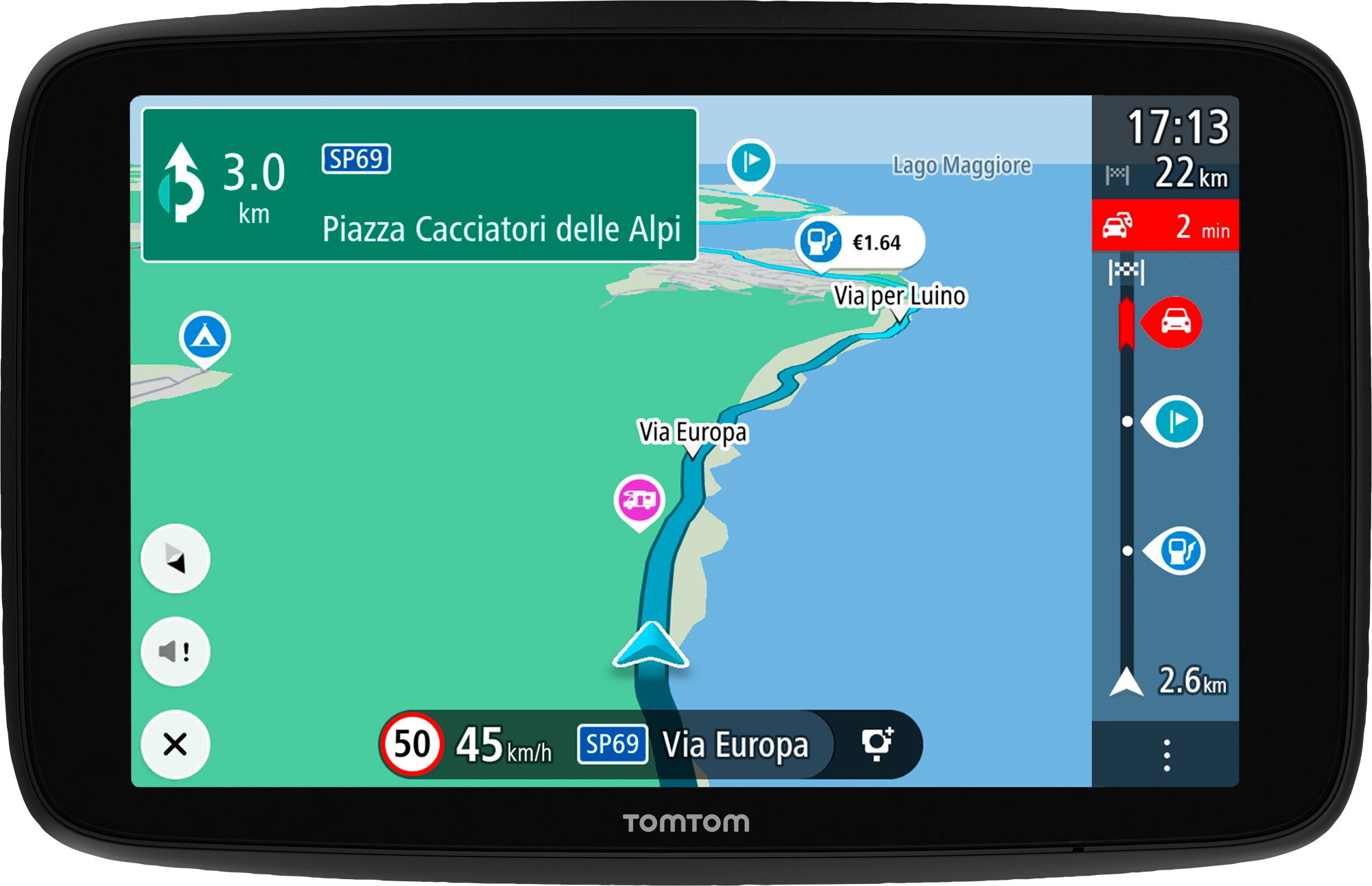 Effizientes Navigationsgerät für Wohnmobile und Pkw Speziell für Wohnmobile, Wohnwagen und Pkw optimierte Routen verhindern Engpässe wie niedrige Brücken und enge Straßen. Mit campingspezifischen POIs und TomTom Traffic für Verkehrsstörungen bleibt die Fahrt stressfrei. Das Gerät bietet schnelle Kartenupdates über WLAN, ein Probejahr für Radarkamerawarnungen und Live-Kraftstoffpreise für die günstigsten Tankstellen. Klarer Sound und eine benutzerfreundliche Oberfläche machen die Navigation einfach, unterstützt durch Funktionen wie den dynamischen Fahrspurassistenten und eine einfache Click & Drive-Navihalterung. Details: * Spezielle Routen für Wohnmobile, Wohnwagen und Pkw * Campingspezifische Sonderziele (POIs) * TomTom Traffic für Verkehrsvermeidung * Schnelle Kartenupdates über eingebautes Wi-Fi * Echtzeit-Radarkamerawarnungen für ein Jahr * Live-Informationen zu Kraftstoffpreisen für ein Jahr * Leistungsstarker Lautsprecher für klare Sprachanweisungen * Intuitive Benutzeroberfläche * Dynamischer Fahrspurassistent * Click & Drive-Navihalterung Technische Daten: * 7-Zoll-Display: 1280 x 800 Pixel High Definition * Interner Speicher: 32 GB * RAM-Speicher: 2 GB * Wi-Fi: 2,4 GHz und 5 GHz * Bluetooth (für den Empfang von TomTom-Diensten): Ja * Sprachsteuerung: Ja * TomTom-Dienste via Smartphone: Ja * TomTom-Dienste über eine eingebaute SIM-Karte: Nein * Gebäude in 3D: Ja * Akkulaufzeit (bei 100% Helligkeit): bis zu 116 Minuten Lieferumfang: * Click & Drive-Navihalterung * Autoladegerät * USB-Kabel * Kurzanleitung Für optimalen Support:https://help.tomtom.com/hc/de-de Art Navigationssysteme: Navigationsgerät, Ausführung: Camper Max, Maße Monitor (BxHxT): 187 x 122 x 20 mm, Bluetooth Datenzugriff: Ja, Displaydiagonale: 7 „“, Farbe: Schwarz, Gewicht: 360 g