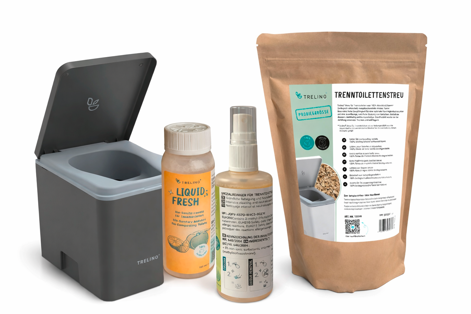 Trelino Evo L – komfortable Trenntoilette für den festen Einbau Mit der Trelino Evo L nutzt Du eine wasserlose und chemiefreie Trenntoilette, die hohen Sitzkomfort mit einem wohnlichen Wie-zu-Hause-Gefühl verbindet. Der ergonomische Toilettensitz mit Softclose-Automatik, die angenehme, an herkömmliche Toiletten angelehnte Sitzhöhe und das große Fassungsvolumen machen sie ideal für den dauerhaften Einsatz. Sie eignet sich perfekt für die feste Installation in Wohnmobilen, Caravans, Tiny Houses oder Gartenhäusern und kann bei Bedarf mit einem Lüftersystem ergänzt werden. Zusätzlich zur Toilette sind folgende Artikel enthalten: Trelino Trenntoilettenstreu aus 100 % Weichholzfasern (Fichte und Tanne) zur zuverlässigen Abdeckung der Feststoffe, Trelino Liquid Fresh als biologischer Zusatz für den Urinkanister zur effektiven Geruchsneutralisierung sowie Holy Shine Bio Active zur Reinigung, Pflege und nachhaltigen Geruchsneutralisierung deiner Trenntoilette. Details * Ergonomischer Toilettensitz für hohen Sitzkomfort * Softclose-Automatik für ein Wie-zu-Hause-Gefühl * Hygienisch und geruchsneutral * Sofort einsatzbereit * Großes Fassungsvolumen für den dauerhaften Einsatz * Sehr gutes Größen- und Gewichtsverhältnis * Absolut wasserresistent * Hochwertig verarbeitet und auf Langlebigkeit ausgelegt * Angenehme Sitzhöhe, angelehnt an herkömmliche Toiletten * Geeignet für die feste Installation * Optionaler Anschluss eines Lüftungssystems möglich * In Deutschland produziert unter Berücksichtigung hoher Sozialstandards Technische Daten * Traglast: 150 kg * Volumen Urinkanister: 10,0 Liter * Volumen Feststoffbehälter: 10,0 Liter * Anzahl kleiner Geschäfte: 18 bis 22 * Anzahl großer Geschäfte: 11 bis 20 * Maße (L x B x H): 39 x 33 x 43 cm * Gewicht: 5,75 kg Lieferumfang * 1 x Trelino Evo L Trenntoilette * 1 x Holy Shine Bio Active 100 ml * 1 x Liquid Fresh Sanitärzusatz 100 ml * 1 x Trenntoilettenstreu 1,2 l * 1 x Urinometer Füllstandsanzeige für Trelino Trenntoiletten Modell: Evo, Ausführung: L, Farbe: anthrazit, Gewicht: 5,75 kg