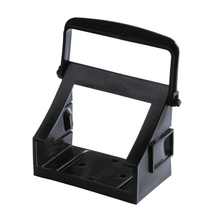 Keilhalterung mit Bügelverschluß aus hochwertigem Kunststoff. Ausführung: Halterung, Farbe: schwarz, Maße (LxBxH): 120 x 82 x 60 mm, Material: 100% Polyethylen