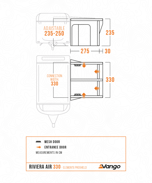 Ein klassisches Design voller praktischer Funktionen für ein Zuhause-Gefühl, wohin du auch gehst. Mit Vangos revolutionärer AirBeam® S.I Pro Single Point Inflation und Multi-Point Deflation, die jedes Mal eine nahtlose Tonhöhe und Verpackung gewährleistet. Hergestellt aus strapazierfähigem Elements ProShield-Gewebe, das sicherstellt, dass deine Markise selbst rauen Wetterbedingungen standhält und überlegene Oberflächen wie Diamond Pro Windows für kristallklare Ansichten und verbesserte Isolierung bietet. Mit einem optionalen Anbau, um deinen Platz für die Lagerung oder zusätzliche Gäste zu erweitern, gibt es ausreichend Platz für die ganze Familie. Mach das Beste aus der Zeit zusammen mit der Vango Riviera. * Überdachter Eingang – Bietet einen geschützten Eingang zu deinem Zelt, was das Eindringen von Regen in den Wohnbereich verhindert. * Flexi Tür: Kann nach Bedarf komplett oder zur Hälfte geöffnet werden. * Geteilte Zugangstür – Mit der 60/40-Teilung der Seitentür kannst du einen Abschnitt für einen schnellen Eingang wegrollen * Diamond Pro Fenster – stärkere Fenster, die für zusätzliche Isolierung und eine bessere Sicht sorgen * Zip Privatsphäre Vorhänge herunter: passen zu den Innenzelt ohne Lücken und roll-up in die Tasche. * Leicht zugängliche Türen für Rollstuhlfahrer oder kleinere Personen * PVC-Schmutz-Streifen im unteren Bereich für eine einfachere Reinigung * AirBeam Pumpe – durch den Doppel-Hub wird das Zelt/Vorzelt sehr schnell aufgepumpt. * Mit dem Manometer und dem Überdruckventil an der Pumpe ist immer der richtige Druck im Zeltschlauch. * Alle unsere Zelte werden in einem zertifizierten Wind und Regen Test-Center geprüft. * Felsheringe aus Stahl mit enthalten * Einstellbare Abspannpunkte * Reflektierende Abspannleine, damit die Abspannpunkte im Dunkeln gut sichtbar sind. * Gewicht: 30,35 Kg * Packmaß: L93 cm x H38 cm x B15 cm * Länge: 275 cm * Breite: 330 cm * Höhe: 235 cm Art Wohnwagenvorzelte: Reisevorzelt, aufblasbar: Ja, Fahrzeugtyp Aufblasbares Vorzelt: Wohnwagenvorzelt, Typ Vorzelt: Teilvorzelt, Gewicht: 30,35 kg, Anbauhöhe (von – bis): 235 – 250 cm, Maße (BxT): 330 x 275 cm, Packmaß (LxBxH): 93 x 15 x 38 cm