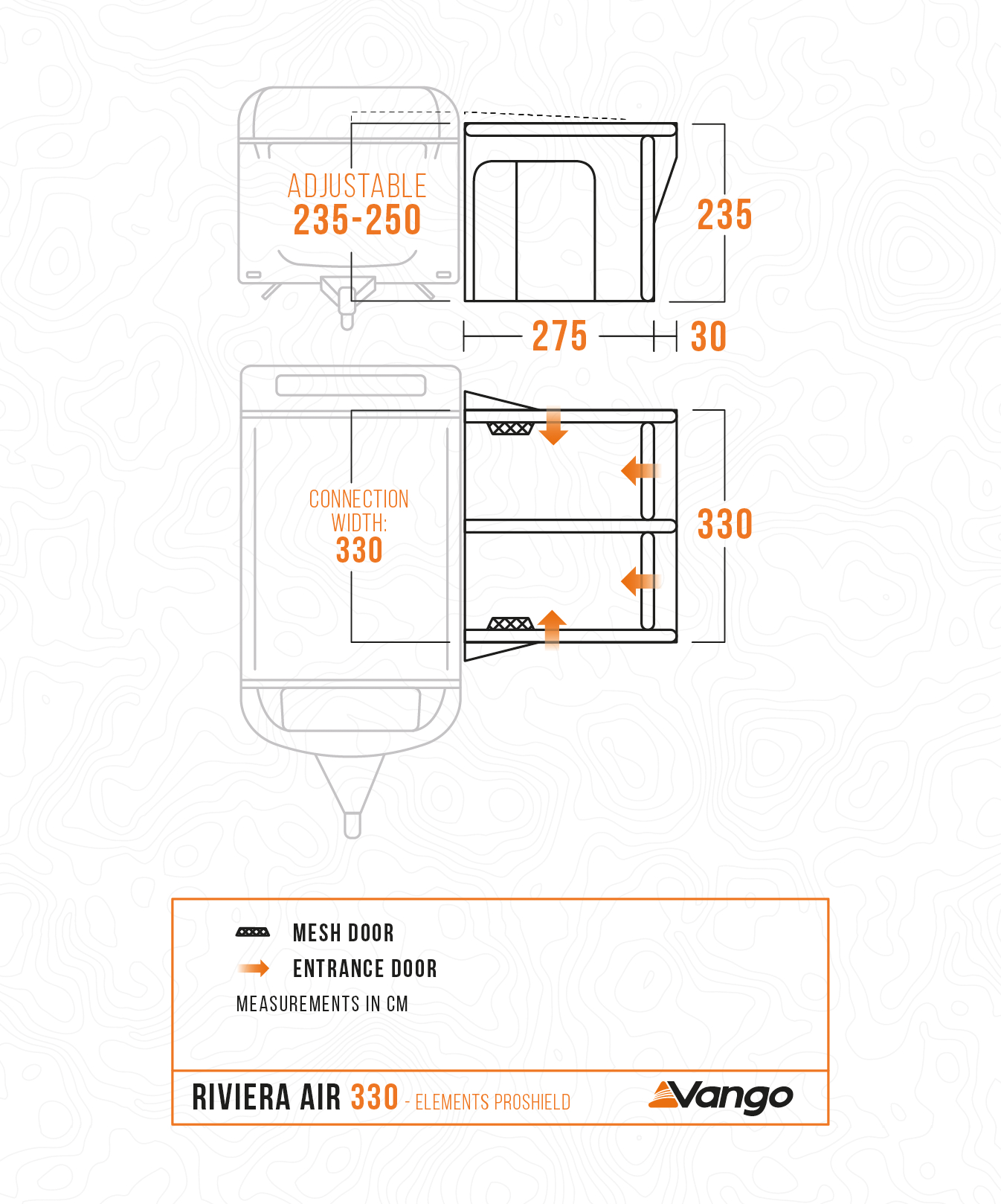 Ein klassisches Design voller praktischer Funktionen für ein Zuhause-Gefühl, wohin du auch gehst. Mit Vangos revolutionärer AirBeam® S.I Pro Single Point Inflation und Multi-Point Deflation, die jedes Mal eine nahtlose Tonhöhe und Verpackung gewährleistet. Hergestellt aus strapazierfähigem Elements ProShield-Gewebe, das sicherstellt, dass deine Markise selbst rauen Wetterbedingungen standhält und überlegene Oberflächen wie Diamond Pro Windows für kristallklare Ansichten und verbesserte Isolierung bietet. Mit einem optionalen Anbau, um deinen Platz für die Lagerung oder zusätzliche Gäste zu erweitern, gibt es ausreichend Platz für die ganze Familie. Mach das Beste aus der Zeit zusammen mit der Vango Riviera. * Überdachter Eingang – Bietet einen geschützten Eingang zu deinem Zelt, was das Eindringen von Regen in den Wohnbereich verhindert. * Flexi Tür: Kann nach Bedarf komplett oder zur Hälfte geöffnet werden. * Geteilte Zugangstür – Mit der 60/40-Teilung der Seitentür kannst du einen Abschnitt für einen schnellen Eingang wegrollen * Diamond Pro Fenster – stärkere Fenster, die für zusätzliche Isolierung und eine bessere Sicht sorgen * Zip Privatsphäre Vorhänge herunter: passen zu den Innenzelt ohne Lücken und roll-up in die Tasche. * Leicht zugängliche Türen für Rollstuhlfahrer oder kleinere Personen * PVC-Schmutz-Streifen im unteren Bereich für eine einfachere Reinigung * AirBeam Pumpe – durch den Doppel-Hub wird das Zelt/Vorzelt sehr schnell aufgepumpt. * Mit dem Manometer und dem Überdruckventil an der Pumpe ist immer der richtige Druck im Zeltschlauch. * Alle unsere Zelte werden in einem zertifizierten Wind und Regen Test-Center geprüft. * Felsheringe aus Stahl mit enthalten * Einstellbare Abspannpunkte * Reflektierende Abspannleine, damit die Abspannpunkte im Dunkeln gut sichtbar sind. * Gewicht: 30,35 Kg * Packmaß: L93 cm x H38 cm x B15 cm * Länge: 275 cm * Breite: 330 cm * Höhe: 235 cm Art Wohnwagenvorzelte: Reisevorzelt, aufblasbar: Ja, Fahrzeugtyp Aufblasbares Vorzelt: Wohnwagenvorzelt, Typ Vorzelt: Teilvorzelt, Gewicht: 30,35 kg, Anbauhöhe (von – bis): 235 – 250 cm, Maße (BxT): 330 x 275 cm, Packmaß (LxBxH): 93 x 15 x 38 cm