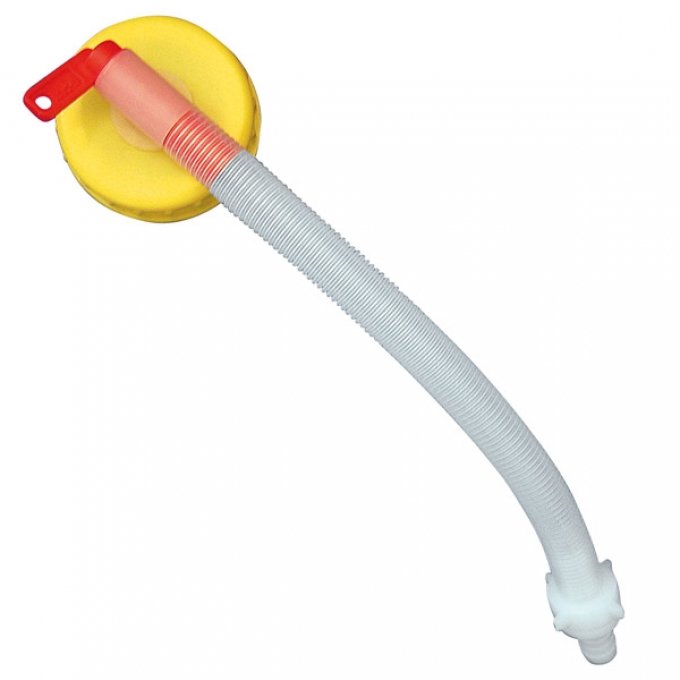 Mit Kunststoffauslasshahn und zusätzlichem Flexschlauch. Passt auf alle Weithalskanister sowie auf das Frischwasser- und Abwassser Taxi. Bestens geeignet auch als Einfüllhilfe. DIN 96. Art Wasser Zubehör: Kombiverschluss, Länge: 30 cm, Durchmesser: 100 mm, Farbe: grau, gelb