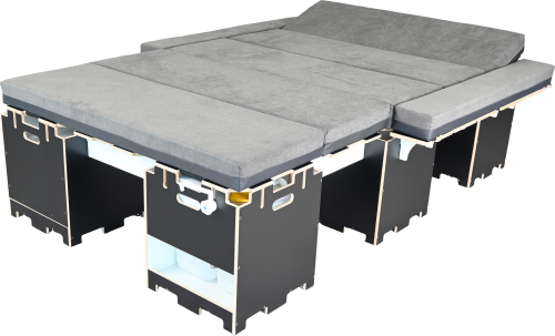 VOJO NOMAD-Black L – DIE MODULARE CAMPINGBOX FÜR ALLE GELEGENHEITEN Das VOJO-Modulsystem verwandelt dein alltägliches Auto in kürzester Zeit in einen echten Minicamper, der mit allem ausgestattet ist, was du für dein nächstes Vanlifeabenteuer brauchst! Mit nur wenigen Handgriffen ist sie startklar – sei es für deinen nächsten Campingtrip oder in verschiedenen Alltagssituationen. VOJO ist ein Built-in-System, das aus einem Set modularer Boxen besteht, die ganz einfach wie Bausteine im Stecksystem-Prinzip mit Holzverbindungsstücken ohne Werkzeug miteinander verbunden und kombiniert werden können. Dadurch ist sie vielseitig einsetzbar: ob als Campingbox im Auto für dein nächstes Abenteuer, als Sitz- oder Wohnbereich im oder vor dem Fahrzeug, Gästebett für Besucher, Kinderzimmermöbel zur Aufbewahrung, als Gartenmöbel, zum Aufbau eines Tresens oder sogar als Homeoffice-Arbeitsplatz und Aufbewahrungsmöbel für Ausrüstung oder Werkzeugen in der Garage. Alle Verbindungsstücke, Klappdeckel und Matratzen sind in bequemen Taschen verstaut, die das Aufbewahren vereinfachen und die Zeit des Einpackens auf ein Minimum verkürzen. Das Nomad Black L Set ist zusätzlich mit Verlängerungen ausgestattet, um das Schlafen auf eine Breite von 150m zu ermöglichen. Dank der Kopfstützen kann die Kopfstütze komfortabel angehoben werden. Das Set ist außerdem mit Das Set ist außerdem mit einer doppelten Buffet Box-Schublade (langer Auzug) und einer Rückenlehne ausgestattet, die den Umbau in einen gemütlichen Sitzbereich ermöglichen. VOJO ist unsere Antwort auf die Suche nach Naturverbundenheit, den Traum von behaglicher Erholung an abgelegenen Orten und die Sehnsucht nach Freiheit. Mobilität: Die Vojo-Boxen passten in jeden Transporter. Sie können ohne Werkzeug Ihr Auto mit dem Vojo-System umbauen. Widerstandsfähigkeit: Hochwertigste Materialien garantieren eine lange Lebensdauer der Vojo-Boxen. Kurze Montagezeit: Sie können Ihr Schlafset oder Ihre Lounge in weniger als 10 Minuten aufbauen. Intuitiv: Der Zusammenbau der Elemente ist kinderleicht. Unabhängigkeit: Sie können jedes Set selbst bauen. Ohne Werkzeug: Mit dem Vojo-System können Sie Ihr Auto ohne Werkzeug bauen. Komfort: Für einen angenehmen Schlaf sorgt die 2-Schichten Kaltschaummatratze Größe im aufgebauten Zustand: 100/150 cm x 200 cm Höhe Größe L: 52,0 cm Lieferumfang: 4x Standard-Box, 1xWasser-Box (inkl. 2 Wasserkanister 13 l mit elektr. Wasserhahn), 1x Buffet 2er Box, 12x Steckverbindungen (lang), 14x Basisstecker, 4x Halterung Rückenlehne, 8x Verlängerung 15cm, 2x Ablagestütze, 2x Kopfstütze, 6x Einzeldeckel, 1x Deckelverlängerung für Arm- und Rückenlehne, Matratze, Matratzenverlängerung Rückenlehne, 4 Transporttaschen, 1 Befestigungsgurt. Maße (LxB): 150 x 200 cm, Packmaß (LxBxH): 80 x 120 x 77 cm, Gewicht: 120 kg, Höhe: 56 cm