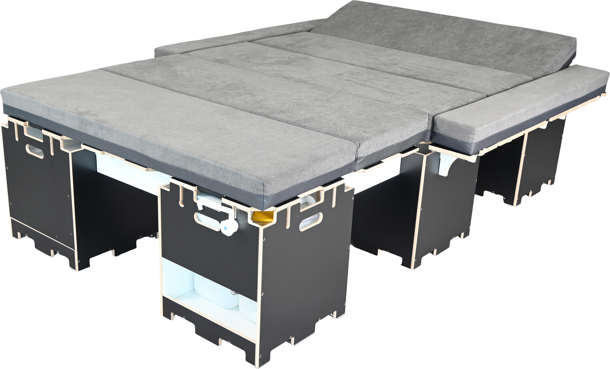 VOJO NOMAD-Black L – DIE MODULARE CAMPINGBOX FÜR ALLE GELEGENHEITEN Das VOJO-Modulsystem verwandelt dein alltägliches Auto in kürzester Zeit in einen echten Minicamper, der mit allem ausgestattet ist, was du für dein nächstes Vanlifeabenteuer brauchst! Mit nur wenigen Handgriffen ist sie startklar – sei es für deinen nächsten Campingtrip oder in verschiedenen Alltagssituationen. VOJO ist ein Built-in-System, das aus einem Set modularer Boxen besteht, die ganz einfach wie Bausteine im Stecksystem-Prinzip mit Holzverbindungsstücken ohne Werkzeug miteinander verbunden und kombiniert werden können. Dadurch ist sie vielseitig einsetzbar: ob als Campingbox im Auto für dein nächstes Abenteuer, als Sitz- oder Wohnbereich im oder vor dem Fahrzeug, Gästebett für Besucher, Kinderzimmermöbel zur Aufbewahrung, als Gartenmöbel, zum Aufbau eines Tresens oder sogar als Homeoffice-Arbeitsplatz und Aufbewahrungsmöbel für Ausrüstung oder Werkzeugen in der Garage. Alle Verbindungsstücke, Klappdeckel und Matratzen sind in bequemen Taschen verstaut, die das Aufbewahren vereinfachen und die Zeit des Einpackens auf ein Minimum verkürzen. Das Nomad Black L Set ist zusätzlich mit Verlängerungen ausgestattet, um das Schlafen auf eine Breite von 150m zu ermöglichen. Dank der Kopfstützen kann die Kopfstütze komfortabel angehoben werden. Das Set ist außerdem mit Das Set ist außerdem mit einer doppelten Buffet Box-Schublade (langer Auzug) und einer Rückenlehne ausgestattet, die den Umbau in einen gemütlichen Sitzbereich ermöglichen. VOJO ist unsere Antwort auf die Suche nach Naturverbundenheit, den Traum von behaglicher Erholung an abgelegenen Orten und die Sehnsucht nach Freiheit. Mobilität: Die Vojo-Boxen passten in jeden Transporter. Sie können ohne Werkzeug Ihr Auto mit dem Vojo-System umbauen. Widerstandsfähigkeit: Hochwertigste Materialien garantieren eine lange Lebensdauer der Vojo-Boxen. Kurze Montagezeit: Sie können Ihr Schlafset oder Ihre Lounge in weniger als 10 Minuten aufbauen. Intuitiv: Der Zusammenbau der Elemente ist kinderleicht. Unabhängigkeit: Sie können jedes Set selbst bauen. Ohne Werkzeug: Mit dem Vojo-System können Sie Ihr Auto ohne Werkzeug bauen. Komfort: Für einen angenehmen Schlaf sorgt die 2-Schichten Kaltschaummatratze Größe im aufgebauten Zustand: 100/150 cm x 200 cm Höhe Größe L: 52,0 cm Lieferumfang: 4x Standard-Box, 1xWasser-Box (inkl. 2 Wasserkanister 13 l mit elektr. Wasserhahn), 1x Buffet 2er Box, 12x Steckverbindungen (lang), 14x Basisstecker, 4x Halterung Rückenlehne, 8x Verlängerung 15cm, 2x Ablagestütze, 2x Kopfstütze, 6x Einzeldeckel, 1x Deckelverlängerung für Arm- und Rückenlehne, Matratze, Matratzenverlängerung Rückenlehne, 4 Transporttaschen, 1 Befestigungsgurt. Maße (LxB): 150 x 200 cm, Packmaß (LxBxH): 80 x 120 x 77 cm, Gewicht: 120 kg, Höhe: 56 cm