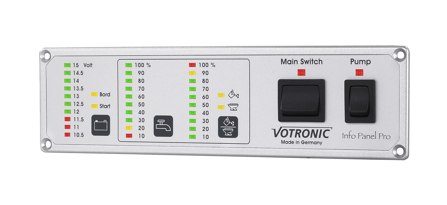 Das VOTRONIC Info Panel hat sich seit seiner Markteinführung hervorragend bewährt und ist nun in seinen Funktionen erweitert worden. Es ist besonders beliebt, weil es die wichtigsten Kontroll- und Schaltaufgaben im Reisemobil übernimmt, und das in besonders kompakter Form. Es überwacht sowohl die Frischwasser-, Abwasser- und Fäkaltanks als auch die Bord- und Startbatterie. Zudem verfügt es über einen Hauptschalter für die Bordbatterie und einen Pumpen-Hauptschalter für die Frischwasserversorgung. Beide natürlich mit Einschaltkontrolle. Zur Überwachung der Bord- und Starter-Batterie dient die Spannungsanzeige auf der linken Seite des Info Panel Pro. Die Leuchtpunktanzeige erbringt eine recht genaue Anzeige der Batteriespannungen, da auch Zwischenwerte auf Grund unterschiedlich hell leuchtender benachbarter Leuchtpunkte gut abzulesen sind. Auf Tastendruck wird die Bord oder Starter-Batteriespannung ausgewählt oder die Anzeige abgeschaltet. Bei niedrigen Batteriespannungen wird durch rote Anzeigen auf die bald fällige Nachladung der Batterie hingewiesen. Die Füllhöhen der Tanks werden als übersichtliche Leuchtbalken mit jeweils 10 Leuchtdioden dreifarbig dargestellt, was die genaue Erfassung der Tankfüllstände auf einen Blick gestattet. Die Anzeigen arbeiten stufenlos, da Zwischenstände mit variabler Helligkeit dargestellt werden und somit auch Tendenzen sofort zu erkennen sind. Beim Be- und Enttanken der Behälter vermittelt die stetig steigende oder fallende Anzeige dem Anwender das direkte Abbild des aktuellen Füllstandes und ermöglicht somit die vollständige Kontrolle des Vorgangs. Dazu trägt auch der Dauerbetrieb der Anzeige bei. Auf Knopfdruck ist die Anzeige ein- und abschaltbar bzw. schaltet sich nach ca. 10 Minuten automatisch wieder ab. Die Tankanzeige auf der rechten Seite des Info Panel Pro lässt sich serienmäßig zusätzlich auf zwei Messeingänge (z.B. Abwasser- und Fäkal-Tank) umschalten. Pro verwendeter Tankanzeige und Tank ist einer der VOTRONIC Tankgeber nach Tankinhalt, Tankhöhe und Montagemöglichkeit am Tank auszuwählen. Nicht benötigte Tankanzeigen (z.B. Fäkal) werden einfach freigelassen. Das Info Panel Pro ist gegen Falschpolung und Überlastung geschützt. Die Anschlüsse sind gut zugänglich und an der beschrifteten Rückseite über 6,3 mm Flachstecker (Leistungsanschlüsse) sowie Schraubklemmen (Signalanschlüsse) herausgeführt. Ausführliche Einbau- und Bedienungsanleitung sowie Bohrschablone für den Möbelausschnitt gehören zum Lieferumfang. Die besonders geringe Einbautiefe von nur 15 mm erlaubt die Montage an nahezu jeder Stelle, dahinter liegender Stauraum kann weiter genutzt werden. Im ausgeschalteten Zustand sind Gerät und alle Tankgeber komplett stromlos. Details * Strom-aufnahme: 0 – 50 mA * Schaltstrom Hauptsch. max.: 16 A * Schaltstrom Pumpe max.: 10 A * Maße (B x H x T): 200 x 55 x 18 mm * Einbaumaße: 175 x 42 x 12 mm Art Batterie: Zubehör, Gewicht: 90 g, Ausführung: Standard