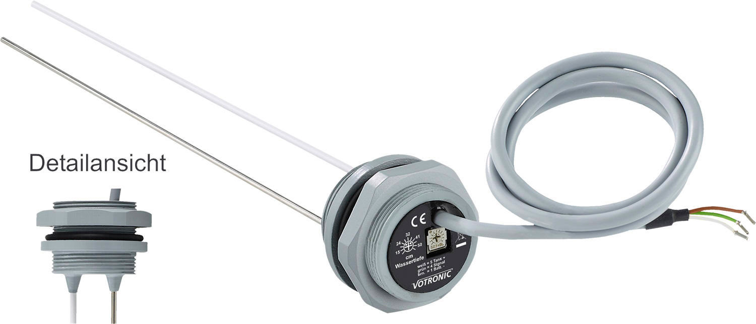 Diese Tanksensoren wurden speziell auf die Füllstandsmessung von Wasser und wasserhaltigen Medien (Frischwasser, Abwasser, Grau- und Brauchwasser, Fäkal) in Metall- oder Kunststoff-Tanks ausgelegt und sind somit universell anwendbar. Die Messelektrode ist einfach auf die Höhe des Tanks zu kürzen und die genaue „Voll“-Justierung erfolgt durch einen Einsteller am Gerät, bei den Tankelektroden 12-24 K / 15-50 K und 20 K-WC mit Hilfe einer Skala auch „trocken“. Details * Prüfzeichen: CE, E-Prüfung (EMV/Kfz-Richtlinie) * Betriebsspannung: 12 und 24 V Die Ausführungen unterscheiden sich im Funktionsumfang wie folgt Tankelektrode 12-24 K mit einstellbarer Tankhöhe von 12 bis 24 cm und Tankelektrode 15-50 K mit einstellbarer Tankhöhe von 15 bis 50 cm * Stabelektrode, einfach auf Tankhöhe zu kürzen * Einbau-Durchmesser 38 mm (bzw. PG 29 Gewinde) * Flansch-Durchmesser 46,5 mm * Anschlusskabel 75 cm lang * Montage am Tank: Ober-/Unterseite * Liferumfang: Dichtungsring, Überwurfmutter PG 29, Bedienungsanleitung Tankelektrode 20 K-WC mit einstellbarer Tankhöhe von 12 bis 24 cm * Stabelektrode, einfach auf Tankhöhe zu kürzen * Einbau-Durchmesser 38 mm (bzw. PG 29 Gewinde) * Flansch-Durchmesser 46,5 mm * Anschlusskabel 75 cm lang * Montage von oben mittels Montagering * Lösbare Steckverbindung für Tankleerung * Montage am Tank: Oberseite * Lieferumfang: Dichtungsring, Überwurfmutter PG 29, Flexible Seilsonde, Tankwanddurchführung, Edelstahl-Ableiter, Befestigungsschrauben, Bedienungsanleitung Tankelektrode 30-110 K-FL mit einstellbarer Tankhöhe von 30 bis 110 cm * Flexible Seilsonde, einfach auf Tankhöhe zu kürzen * Einbau-Durchmesser 38 mm (bzw. PG 29 Gewinde) * Flansch-Durchmesser 46,5 mm * Anschlusskabel 75 cm lang * Montage am Tank: Oberseite * Liferumfang: Dichtungsring, Montagering mit Befestigungsschrauben, Stecker und Steckbuchse mit Arretierung, Halteclip, Bedienungsanleitung Tank-Sensor FL mit einstellbarer Tankhöhe von 30 bis 100 cm * Flexible Seilsonde, einfach auf Tankhöhe zu kürzen * Nur für Tanks mit Reinigungsöffnung geeignet * Bei Kunststofftanks: Wandstärke max. 8 mm * Anschluss über Schraubklemmen * Montage am Tank: Oberseite/Seitenwand * Liferumfang: Flexible Seilsonde, Tankwanddurchführung, Edelstahl-Ableiter, Befestigungsschrauben, Bedienungsanleitung Art Wasser Zubehör: Tank-Anschluss, Ausführung: Tankelektrode 12-24 K
