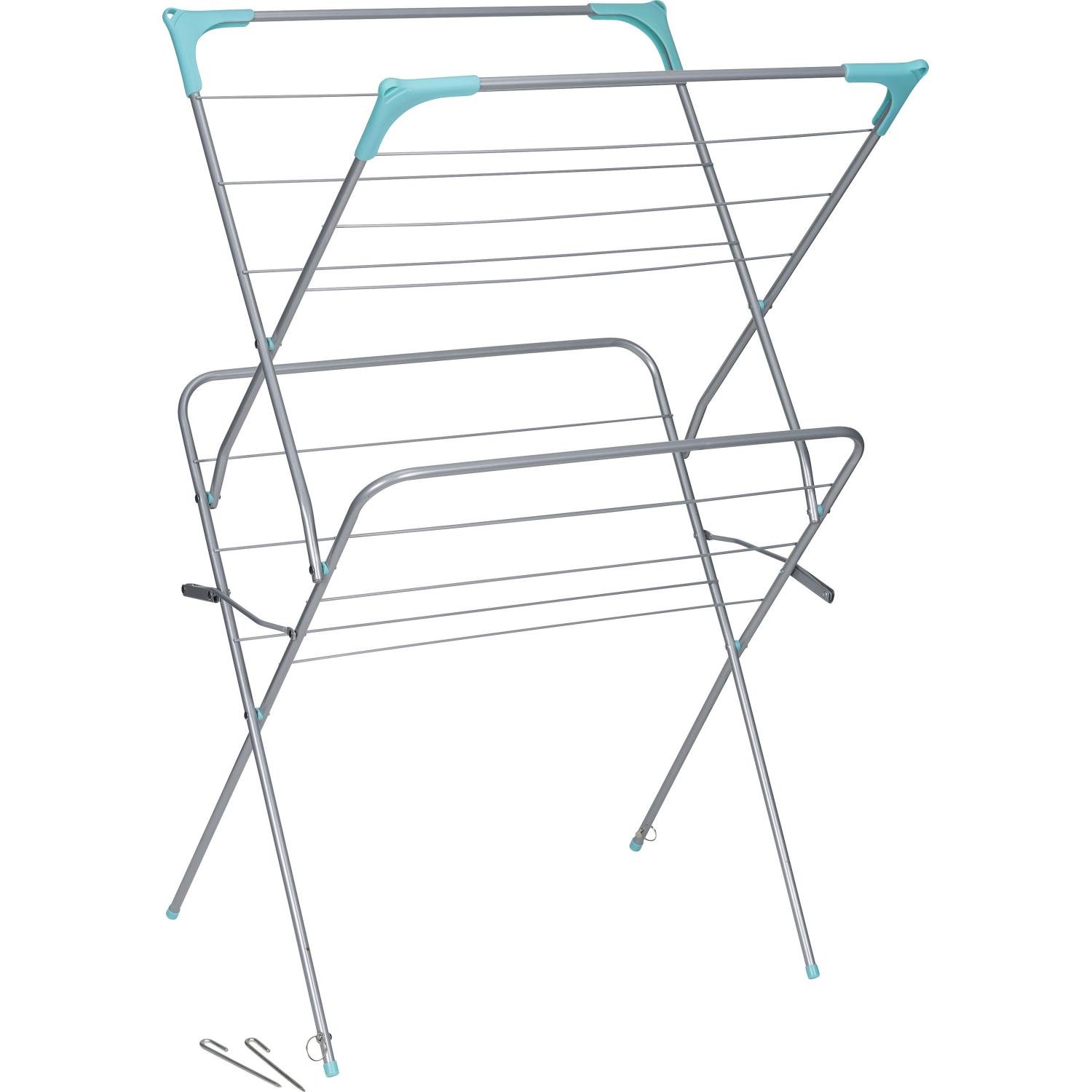 Ideal für Camping, Caravan und Haushalt. Er ist extrem platzsparend und hat ein sehr flaches Packmaß von nur 5 cm. Die seitlichen Sicherungsbügel ermöglichen einen sicheren Stand, zusätzlich kann der Wäschetrockner mittels der Zeltnägel (im Lieferumfang enthalten) befestigt werden. Länge der Wäschelänge gesamt ca. 9,3 m. Gestell aus pulverbeschichtetem Metallrohr, Kantenschutz aus Kunststoff. Größe: 62x50x100 cm. Länge Packmaß: 5 cm, Länge offen: 9,3 m, Material: Gestell aus pulverbeschichtetem Metallrohr, Kantenschutz aus Kunststoff, Farbe: silber