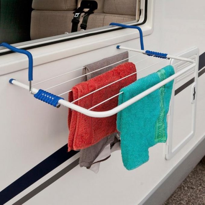 Für den Camping- und Haushaltsbereich. Klein, praktisch und platzsparend verstaubar. Haltebügel verstellbar. 6 Stäbe, Drahtgestell aus pulverbeschichtetem Metall, ersetzt ca. 3 m Leinenlänge. Maße offen (LxBxH): 51 x 26 x 13 cm, Material: pulverbeschichtetes Metall, Farbe: weiß