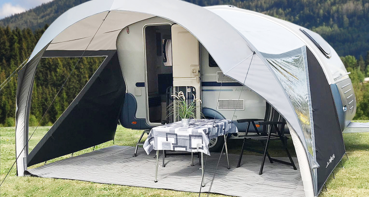 Sonnenvordach Patio Speziell entwickelt für den Saisoncamper! Das neue Walker Patio ist ein Sonnenvordach mit 235 cm Tiefe und wurde speziell entwickelt für den Saisoncamper der sein Vordach von Frühjahr bis Herbst nutzt. Das Stahlgestänge hat einen Durchmesser von 25 mm und verfügt über extra Dachstangen. Alle Tunnels (Hohlsäume) für die Zeltstangen sind mit Reißverschlüssen ausgestattet und ermöglichen so eine bequeme Montage. Nach dem entfernen der Seitenwände kann der Dachteil des Sonnenvordaches bei schlechtem Wetter sogar aufgerollt werden! Das Gestänge kann dann einfach stehen bleiben. Zum Standardlieferumfang des Patio gehören 2 Seitenwände mit Fenster. Diese sind durch Reißverschlüsse abnehmbar. Powergrips, Sturmgurte und Gardinen für die Seitenwände sind gegen Aufpreis erhältlich. Das Patio wird serienmäßig geliefert mit Keder und 3 Dachhaken zur Befestigung direkt an den Wohnwagen. Die Seitenwände können Sie nicht benützen beim Patio direkt am Wohnwagen. Die Seitenwände werden in den Farben des Vorzeltes geliefert: * WS-1 – in den Farben Walker Allure, Atrium, Palladium * WS-4 – in den Farben Walker Signum und Atrium – iceblue * WS-5 – PVC / in den Farben Walker Concept * WS-6 – in den Farben Walker Pioneer All Season * WS-7 – in den Farben Walker Fusion II Details * Packmaß: 117 x 17 x 30 (L x B x H) * AB Göße (Abstand vom Mittelstück (A) zum Eckstück (B) des Vorderdaches vom Vorzelt): Umlaufmaß Passender AB Abstand 780-810 178 cm 796-825 178 cm 810-840 193 cm 826-855 193 cm 840-870 208 cm 856-885 208 cm 870-900 223 cm 886-915 223 cm 900-930 238 cm 916-945 238 cm 930-960 253 cm 946-975 253 cm 960-990 268 cm 976-1005 268 cm 990-1020 268 cm 1006-1035 268 cm 1020-1050 268 cm 1036-1065 268 cm 1050-1080 268 cm Art Markisen und Dächer: Vordach und Sonnensegel, Material: 100 % Polyester Ten Cate, Tiefe: 230 cm, Gewicht: 34 kg, Umlaufmaß: 826 – 855 cm