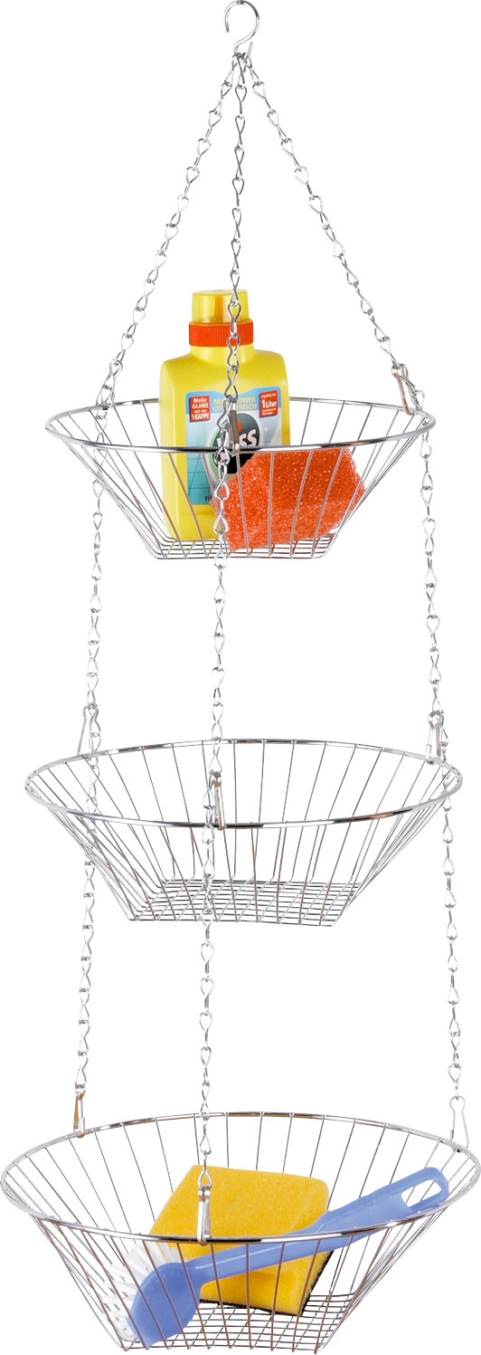 Diese formschöne Küchenampel ist eine nützlicher Helfer in jedem Haushalt. Mit drei Ablagekörben bietet sie viel Platz für Obst, Gemüse oder Kleinutensilien. Durch den praktischen Rundhaken wird die Ampel ganz einfach und platzsparend an der Decke aufgehängt. Eigenschaften: * 3 Ablagekörbe durch Hängeketten verbunden * praktische, platzsparende Aufhängung an der Decke * mit Rundhaken zum Einhängen am Decken- oder Regalhaken * Artikelgröße (Ø x H): 28 x 77 cm Farbe: silber, Gewicht: 520 g, Material: verchromtes Metall, Maße (BxH): 28 x 77 cm