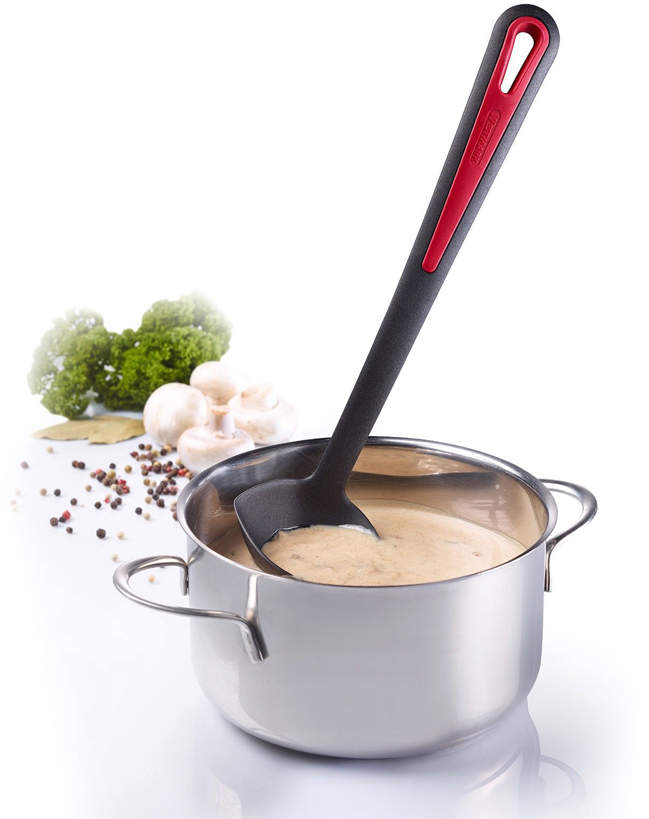Westmark Gallant Soßenkelle – sauber servieren mit doppeltem Ausgießer Mit der Westmark Gallant Soßenkelle rührst Du Soßen bequem in Topf oder Pfanne um und servierst sie kontrolliert. Zwei seitliche, spitz zulaufende Ausgießer helfen Dir beim Umfüllen, damit nichts daneben geht. Das hochwertige Polyamid schont beschichtete Töpfe und Pfannen, der Komfort-Soft-Touch-Griff liegt angenehm in der Hand. Details * Soßenlöffel zum Servieren von Soßen oder zum Umrühren in Pfanne und Kochtopf * Zwei seitliche, spitz zulaufende Ausgießer für sauberes Ausgießen * Ideal für antihaftbeschichtetes Kochgeschirr, kein Zerkratzen * Verfärbungsresistent und hitzebeständig bis 210 °C * Mit ergonomischem Komfort-Soft-Touch-Griff * Durch Aufhänge-Öse platzsparend verstaubar * Spülmaschinengeeignet * Bisphenol-A-frei Technische Daten * Maße: 29 x 7,9 x 6 cm * Gewicht: 62 g * Material: Kunststoff * Farbe: Schwarz/Rot Lieferumfang * 1 x Westmark Soßenlöffel Gallant Material: Kunststoff