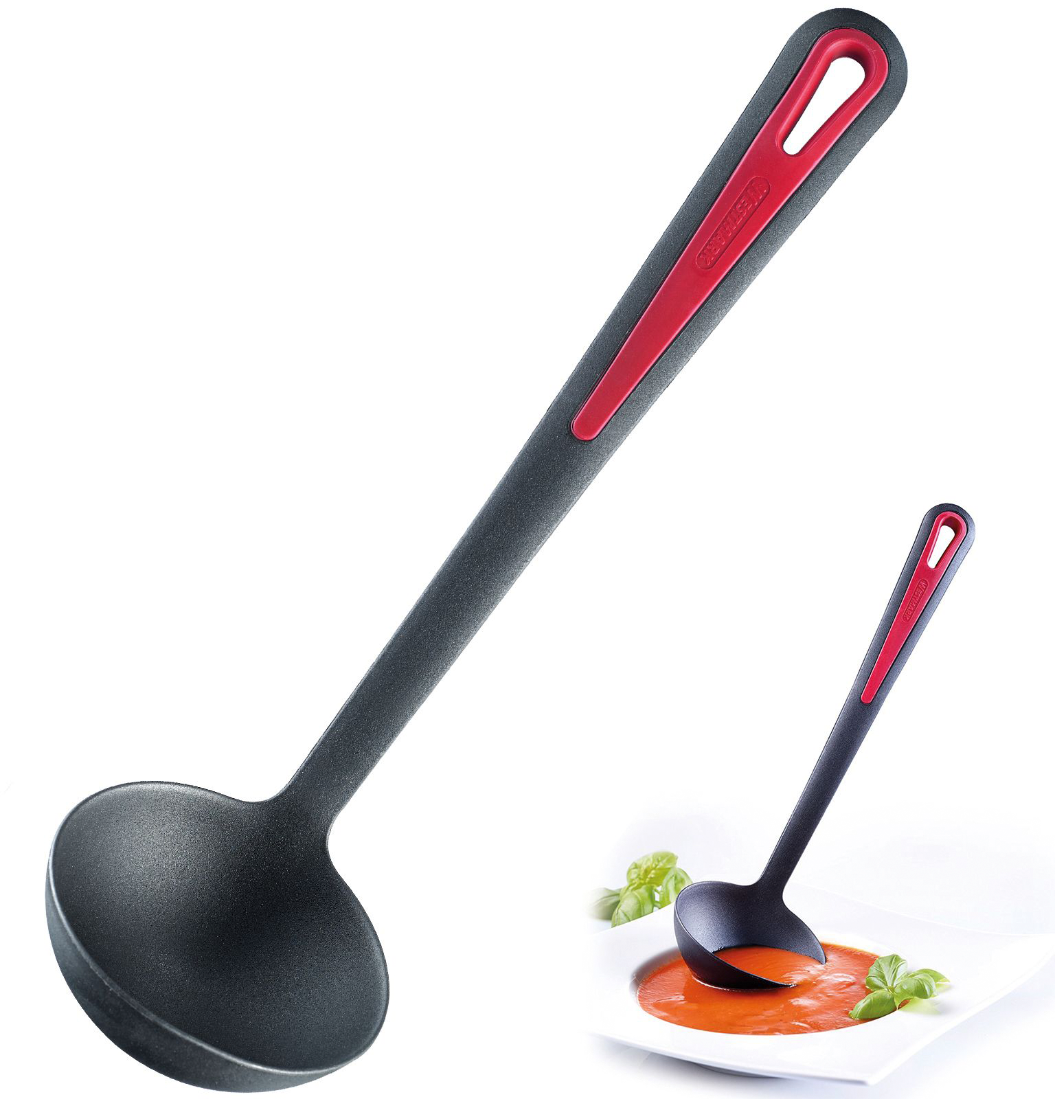 Westmark Gallant Suppenkelle – mühelos rühren, umfüllen und servieren Mit der Westmark Gallant Suppenkelle rührst, schöpfst und servierst Du Suppen und Eintöpfe ganz entspannt. Der hochwertige Kunststoff schont beschichtete Töpfe und Pfannen, die Kelle ist verfärbungsresistent und hitzebeständig bis 210 °C. Der lange Komfort-Soft-Touch-Griff liegt angenehm in der Hand und dank Aufhänge-Öse ist alles schnell verstaut. Details * Suppenkelle zum Umrühren und Servieren von flüssigen Speisen wie Suppen oder Eintöpfen * Ideal für antihaftbeschichtetes Kochgeschirr, kein Zerkratzen durch Kunststoffmaterial * Verfärbungsresistent und hitzebeständig bis 210 °C * Komfort-Soft-Touch-Griff, lang und abgerundet, ergonomisch * Mit Aufhänge-Öse, platzsparend verstaubar * Spülmaschinengeeignet * Bisphenol-A-frei Technische Daten * Maße: 31,5 x 9,2 x 8,3 cm * Fassungsvermögen: ca. 100 ml * Gewicht: 80 g * Material: Kunststoff * Farbe: Schwarz/Rot Lieferumfang * 1 x Westmark Suppenkelle Gallant Material: Kunststoff