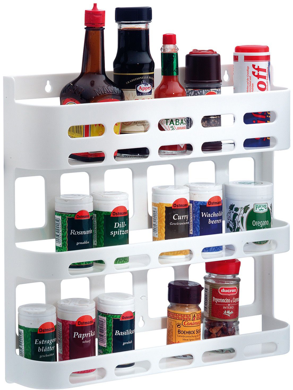 Westmark Parato Gewürzregal – 3 Etagen für Gläser und Dosen Mit dem Westmark Parato Gewürzregal sortierst Du Gewürzgläser und Dosen übersichtlich und hast sie schnell griffbereit, ob an der Wand oder innen an der Schranktür. Die extra tiefen Abstellflächen geben sicheren Halt, der obere Boden hat zusätzlich eine hohe Leiste für Flaschen und längliche Behälter. Dank Befestigungsmaterial montierst Du es einfach, und bei Bedarf reinigst Du es per Hand oder in der Spülmaschine. Details * Gewürzregal mit 3 Böden zum Sortieren und Verstauen von Gewürzdosen und Gewürzgläsern * Extra tiefe Abstellflächen mit 6 cm Tiefe für stabilen Stand * Oberster Regalboden mit hoher Leiste für Gewürzflaschen sowie längliche und hohe Behälter * Geeignet für Wand- und Innentürbefestigung * Einfache Montage mit 3 Schrauben und 3 Dübeln, Befestigungsmaterial inklusive * Leicht zu reinigen, per Hand oder spülmaschinengeeignet * Bisphenol-A-frei Technische Daten * Abmessungen: 379 x 69 x 349 mm * Tiefe Abstellflächen: 6 cm * Material: Kunststoff * Farbe: Weiß Lieferumfang * 1 x Westmark Gewürzregal Parato * 3 x Schrauben * 3 x Dübel