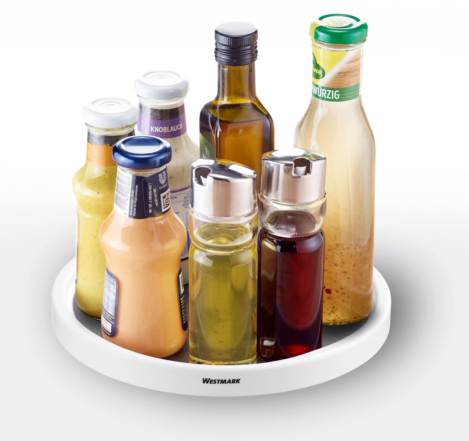 Westmark Ronda Drehteller – 360° Organizer für Küche, Tisch und Bad Mit dem Westmark Ronda Drehteller bringst Du Ordnung in Küche, Kühlschrank, Bad oder auf den Esstisch und holst Dir alles mit einer Drehung nach vorn. Dank hochwertigem Leichtlauf-Kugellager drehst Du die Platte ruckfrei, während die rutschfeste Oberfläche, der erhöhte Rand und der rutschfeste Standfuß Deine Utensilien sicher an Ort und Stelle halten. Details * 360° drehbar für schnellen Zugriff * Hochwertiges Leichtlauf-Kugellager für leichtes, ruckfreies Drehen * Vielseitig einsetzbar, zum Beispiel am Esstisch, in der Küche, als Kühlschrank-Organizer oder im Badezimmer * Rutschfeste Telleroberfläche für sicheren Halt der Utensilien * Hochgezogener Rand verhindert leichteres Herunterfallen * Rutschfester Standfuß * frei von Bisphenol A * Handwäsche empfohlen Technische Daten * Durchmesser: 25 cm * Abmessungen: 25 x 25 x 3,7 cm * Material: Kunststoff Lieferumfang * 1 x Westmark Drehteller Ronda Material: Kunststoff