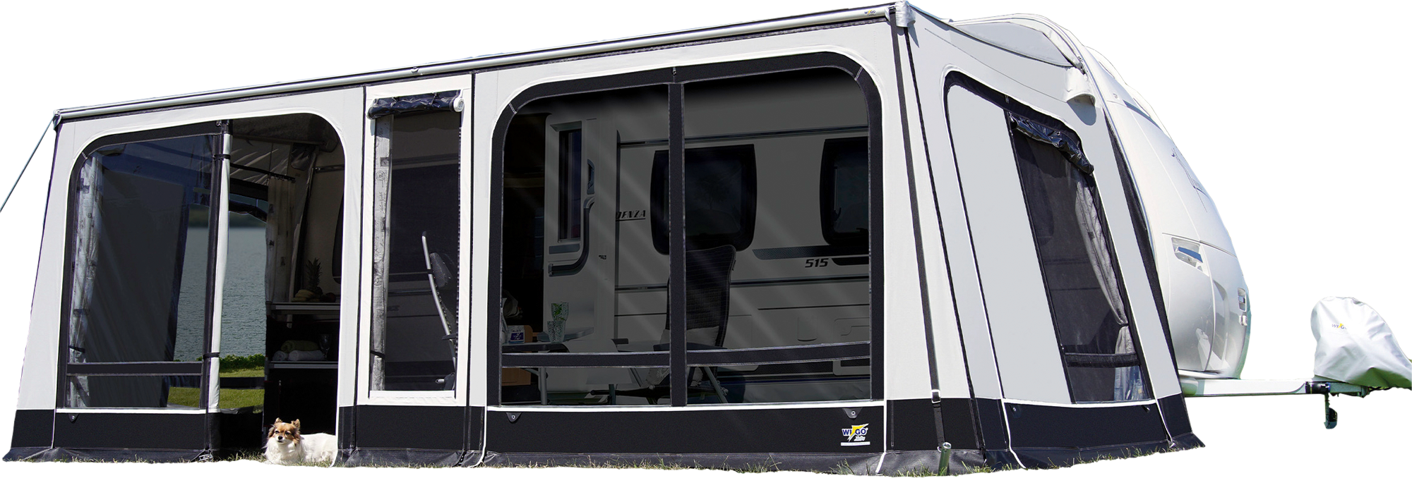 Wigo Sackmarkise Rolli plus Volleinzug mit Markisenzelt Die Wigo Markise Ambiente ist das Top-Modell unter den Rolli-Modellen und erfüllt alle Wünsche des anspruchsvollen Campers. Die neueste Entwicklung unter unseren Rollis lässt jedes Camperherz höher schlagen. Die verfügbaren Tiefen von 250 cm und 300 cm plus die Möglichkeit, das Rolli durch einen einfachen Umbau mit einer Panoramafunktion auszustatten, machen dieses Modell zu einem echten Allroundtalent. Details: * Panoramafunktion durch einfachen Umbau möglich (Zubehör gegen Aufpreis) * Fünf Dach- und drei Aufstellstangen mit Power-Grip * Abgedeckte Reißverschlüsse * Schneller Aufbau * Geringes Gewicht Materialien: Dach aus vollsynthetischer Spezialdachware TenCate All Season, einseitig beschichtet, Unterseite bedruckt (reduzierte Schwitzwasserbildung), Spritzschutz und Faulstreifen aus beidseitig PVC-beschichtetem Polyestergewebe. Hier gehts zur Aufbauanleitung! Optional erhältlich: Sonnenvordach und Zubehör für Panoramafunktion (NICHT im Lieferumfang enthalten) Verfügbare Größen Größe 5Umlaufmaß 841 – 875 cmGröße 6Umlaufmaß 876 – 910 cmGröße 7Umlaufmaß 911 – 945 cmGröße 7bUmlaufmaß 894 – 929 cmGröße 8Umlaufmaß 946 – 980 cmGröße 8bUmlaufmaß 930 – 964 cmGröße 9Umlaufmaß 981 – 1015 cmGröße 9bUmlaufmaß 965 – 999 cmGröße 10Umlaufmaß 1016 – 1050 cmGröße 10bUmlaufmaß 1000 – 1034 cmGröße 11Umlaufmaß 1051 – 1085 cmGröße 11bUmlaufmaß 1035 – 1069 cmGröße 12Umlaufmaß 1086 – 1120 cmGröße 13Umlaufmaß 1121 – 1155 cmGröße 14Umlaufmaß 1156 – 1191 cmGröße 15Umlaufmaß 1192 – 1227 cm Lieferumfang: * Dach mit Aluminium-Profil * Dach- und Aufstellstangen aus Aluminium mit Power-Grip * Rad- und Windschutz * Abspannmaterialien * Aufbauanleitung Hinweise: * Entgegen der Angaben in der Aufbauanleitung des Herstellers sind keine Gardinen im Lieferumfang enthalten * Ab Größe 8 (Umlaufmaß 946-980 cm) enthält die Frontwand zusätzlich den mittigen Gazeblock; Die Frontwand besteht also aus Fenstersegment, Türsegment und Doppelfenstersegment, ab Größe 8 ergänzt um den Gazeblock in der Mitte Art Markisen und Dächer: Sackmarkise, Art Markisen und Dächer: Markisenzelt, Art Markisenwand /-Zelt: Markisenvorzelt inkl. Markise, Art Wohnwagenvorzelte: Reisevorzelt, aufblasbar: Nein, Farbe: weiß/grau/schwarz, Markisenauszug: 300 cm, Material: 100 % Polyester, Tuchfarbe: hellgrau, Abgedeckte Reissverschlüsse: Ja, Seitenwand herausnehmbar: Ja, Vorderwand herausnehmbar: Ja, Gewicht: 52 kg, Umlaufmaß: 1192 – 1227 cm, Länge: 300 cm, Höhe: 255 cm