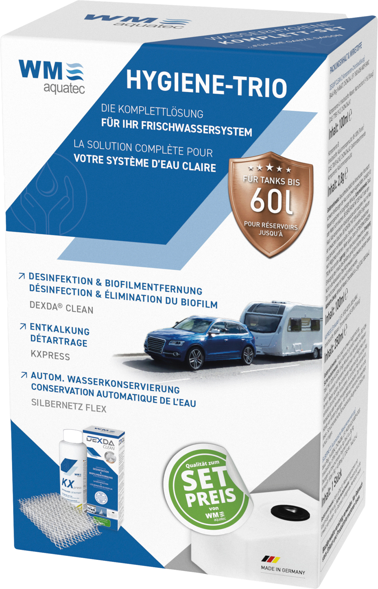 Hygienische Perfektion für unterwegs: Effektive Reinigungslösungen und automatische Wasserkonservierung Die Reiniger-Kombination DEXDA Clean & KXpress sowie das Silbernetz bieten eine effiziente Reinigungslösung für Camping, Boote und wasserführende Systeme mit Fokus auf hygienischer Sicherheit. DEXDA Clean ist ein starkes Desinfektionskonzentrat, 25x stärker als Aktivsauerstoff, zugelassen gemäß deutscher Trinkwasserverordnung. Das Silbernetz konserviert Frischwasser automatisch durch die Abgabe von reinen Silberionen, mit verschiedenen Varianten für unterschiedliche Tankgrößen. Empfohlen wird ein jährlicher Wechsel des Silbernetzes. Das Hygiene-Trio ist erhältlich für Tankgrößen bis 60, 100, 160, 320 und 500 Liter. Lieferumfang: Hygiene Trio 60 l: * 1x 100 ml Dexda Clean Desinfektionsreiniger (BauA-Reg. Nr. N-86607) * 1 x 250 ml KXpress Entkalker * Silbernetz (für 60 l) (BauA-Reg. Nr. N-65554) Hygiene Trio 100 l: * 1x 250 ml Dexda Clean Desinfektionsreiniger (BauA-Reg. Nr. N-86607) * 1 x 250 ml KXpress Entkalker * Silbernetz (für 100 l) (BauA-Reg. Nr. N-65554) Hygiene Trio 160 l * 1x 250 ml Dexda Clean Desinfektionsreiniger (BauA-Reg. Nr. N-86607) * 1 x 250 ml KXpress Entkalker * 1 x Silbernetz (für 160 l) (BauA-Reg. Nr. N-65554) Hygiene Trio 320 l * 2 x 250 ml DEXDA Clean Desinfektionsreiniger (BauA-Reg. Nr. N-86607) * 2 x 250 ml KXpress Entkalker * 1 x Silbernetz (für 320 l) (BauA-Reg. Nr. N-65554) Hygiene Trio 500 l * 1 x 1000 ml DEXDA Clean Desinfektionsreiniger (BauA-Reg. Nr. N-86607) * 1 x 1000 ml KXpress Entkalker * 1 x Silbernetz (für 500 l) (BauA-Reg. Nr. N-65554) Reicht für: 60 l