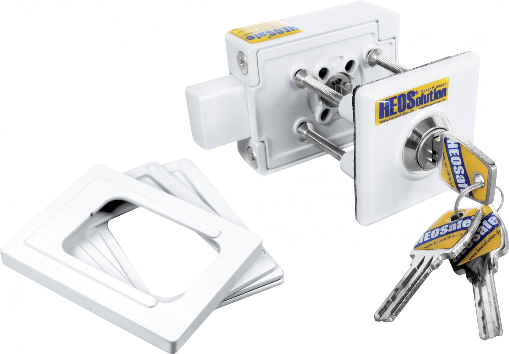 Für Wohnmobil Aufbautüren, Caravan Türen, Heckgaragen, Außenklappen usw. Größe: 77 x 60 x 44 mm * universell einsetzbar * Riegel greift hinter den Türrahmen * Montage ohne Zusatzverstärkung der Türe durch das Zusammenschrauben beider Gehäuse (innen und außen) * Komplett aus Aluminiumdruckguss, sehr stabil / robust und leicht: 500 g * Distanzplatten aus Aluminium für Innenschloss (von 2 bis 22 mm) im Paket enthalten * für Türstärken von 20 bis 90 mm * Zylinder fest montiert, mit Innenbahntechnologie, 10.000 sichere Schließungen * komfortabler Schlüsseleintritt mit Schutzklappe, sowie einem robustem Wendeschlüssel * garantiert einwandfreie und präzise Funktion * bietet einstellbare Drehrichtungen der Schlüssel * vom Wohnraum aus ohne Schlüssel zu öffnen * formschlüssig und präzise Montage aller Bauteile unter Federdruck Achtung: Wenn Sie mehrere Zusatzschlösser ordern (Ausführung), sind diese gleichschließend. Maße (LxB): 77 x 60 mm, Maße (LxBxH): 77 x 60 x 44 mm, Ausführung: 1 Stück, Farbe: weiß